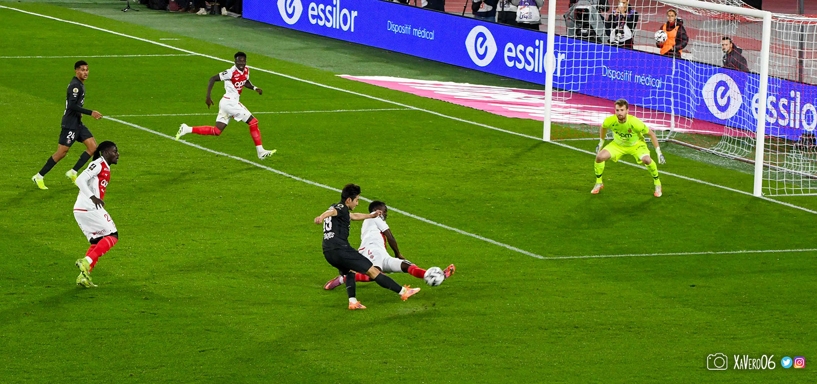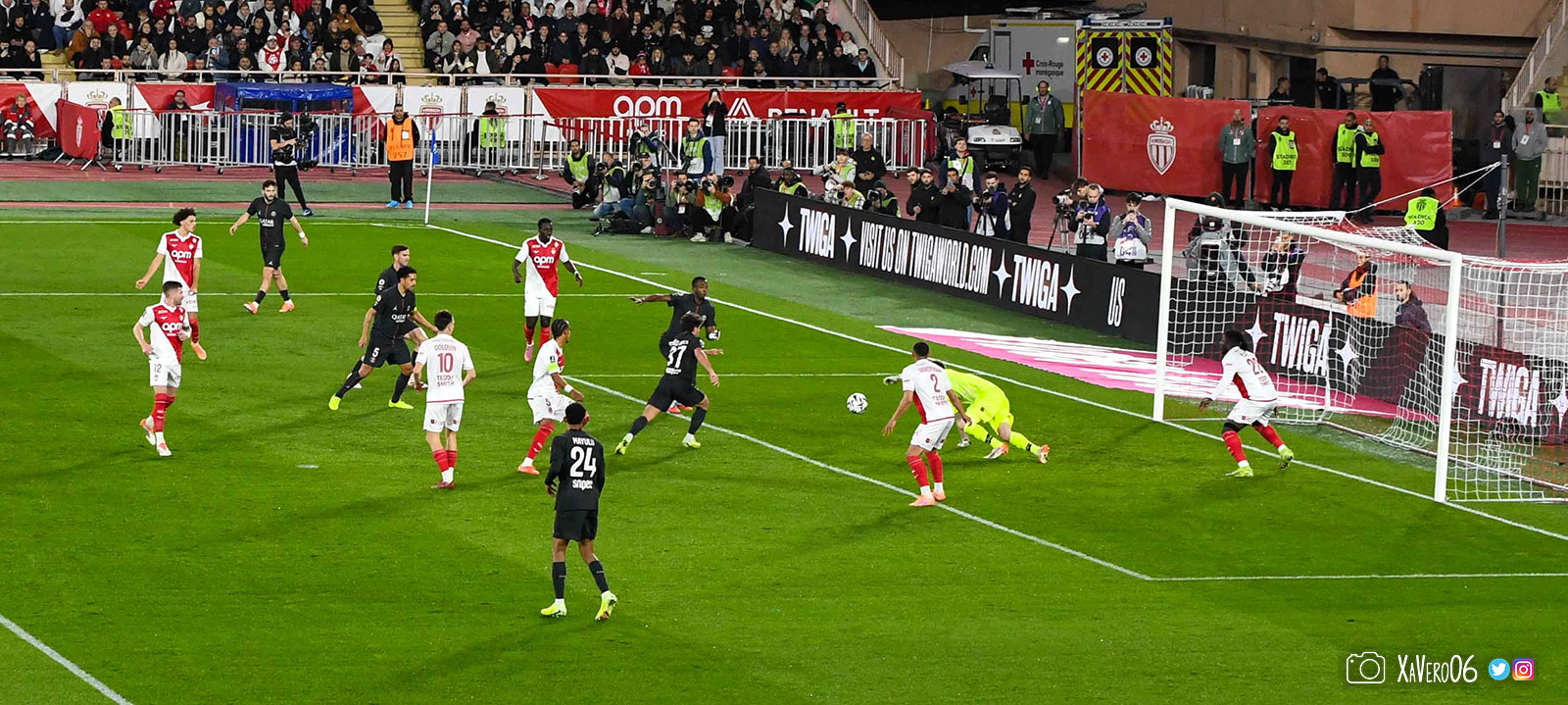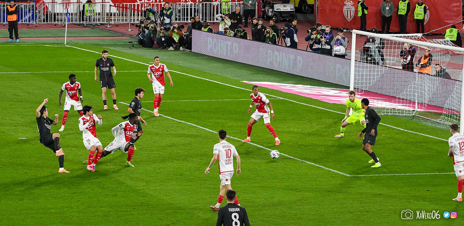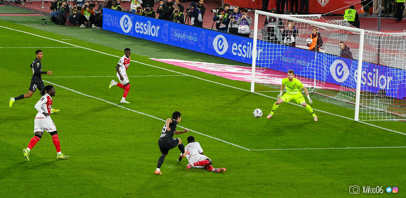 Le chemin vers l'avant est bouché, le ballon redescend jusqu'à Mohammed Salisu en défense côté gauche, qui envoit un long ballon dans la profondeur et le dos de Zaïre-Emery pour Aleksandr Golovin, qui lêve la tête avant de centrer à l'angle gauche de la surface. Son ballon piqué arrive sur Takumi Minamino aux 16m qui contrôle de la cuisse droite et reprend de demi-volée du pied gauche entre Pacho et Marquinhos. Le ballon n'est pas puissant, mais placé et roule au ras du poteau gauche de Chevalier, masqué au départ par ses deux centraux et peut-être par Balogun, nettement hors-jeu au moment de la frappe. Le ballon lui est passé à côté des pieds, les arbitres sur le terrain et à la V.A.R. ne disent rien, les parisiens ne protestent pas, l'AS Monaco prend l'avantage (1-0, 68e).