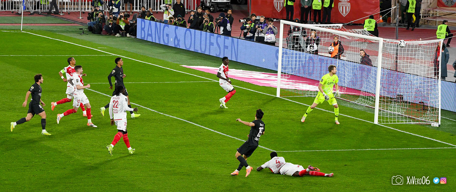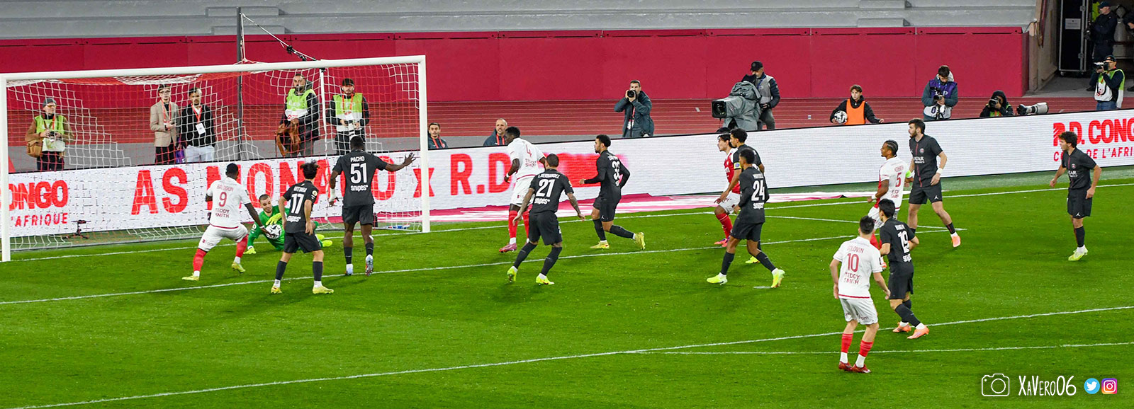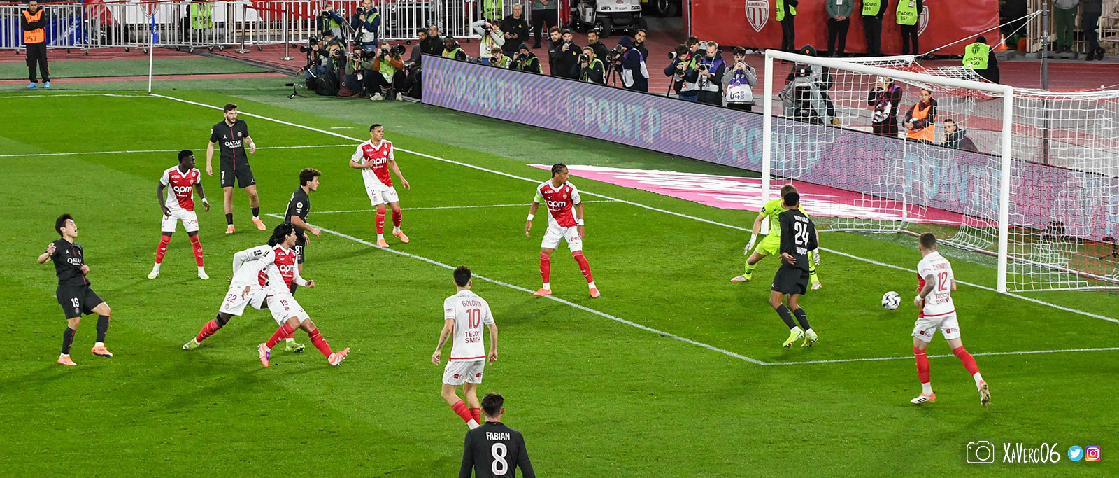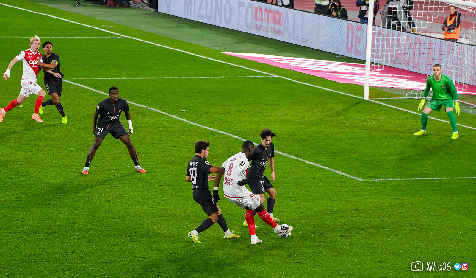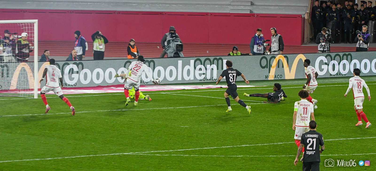 Le chemin vers l'avant est bouché, le ballon redescend jusqu'à Mohammed Salisu en défense côté gauche, qui envoit un long ballon dans la profondeur et le dos de Zaïre-Emery pour Aleksandr Golovin, qui lêve la tête avant de centrer à l'angle gauche de la surface. Son ballon piqué arrive sur Takumi Minamino aux 16m qui contrôle de la cuisse droite et reprend de demi-volée du pied gauche entre Pacho et Marquinhos. Le ballon n'est pas puissant, mais placé et roule au ras du poteau gauche de Chevalier, masqué au départ par ses deux centraux et peut-être par Balogun, nettement hors-jeu au moment de la frappe. Le ballon lui est passé à côté des pieds, les arbitres sur le terrain et à la V.A.R. ne disent rien, les parisiens ne protestent pas, l'AS Monaco prend l'avantage (1-0, 68e).