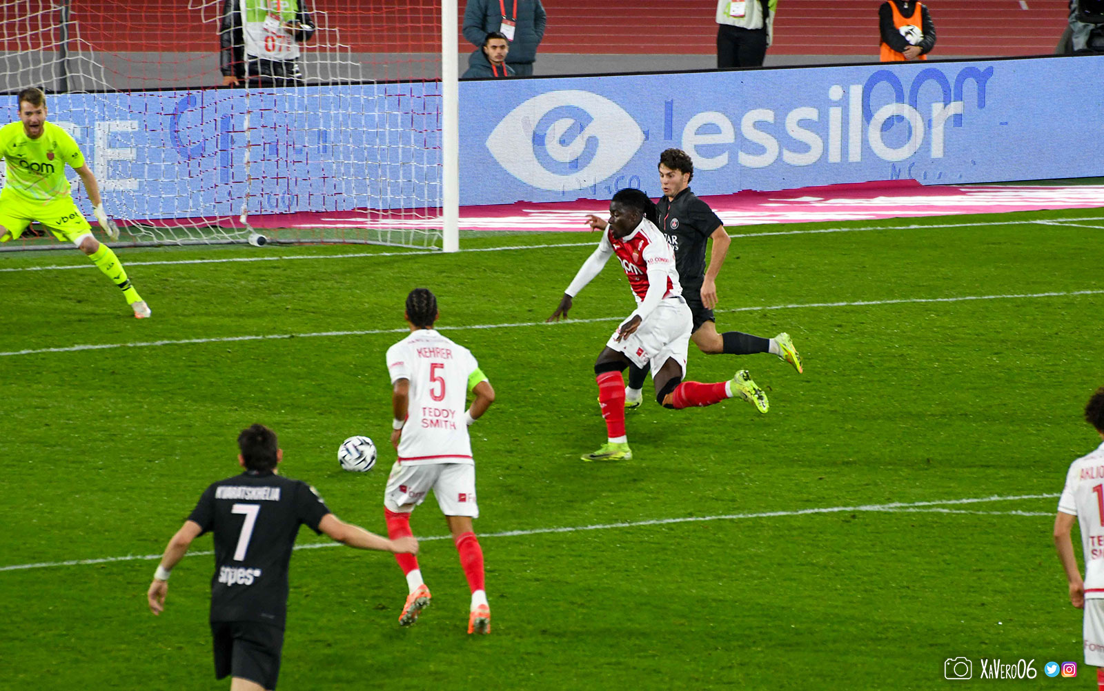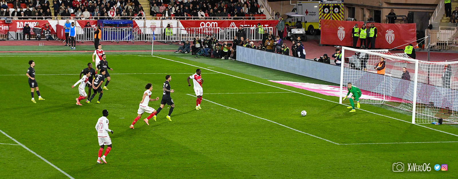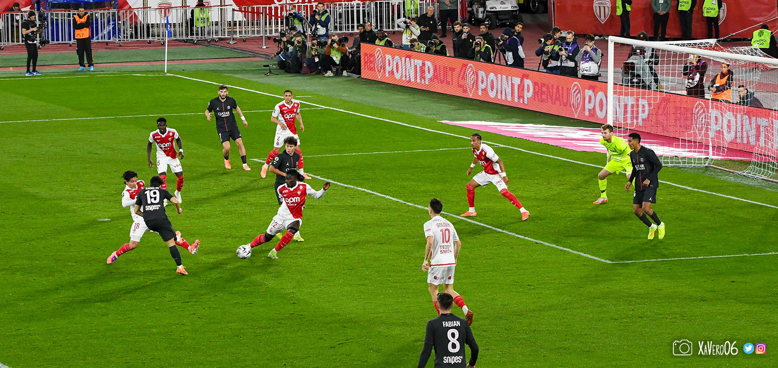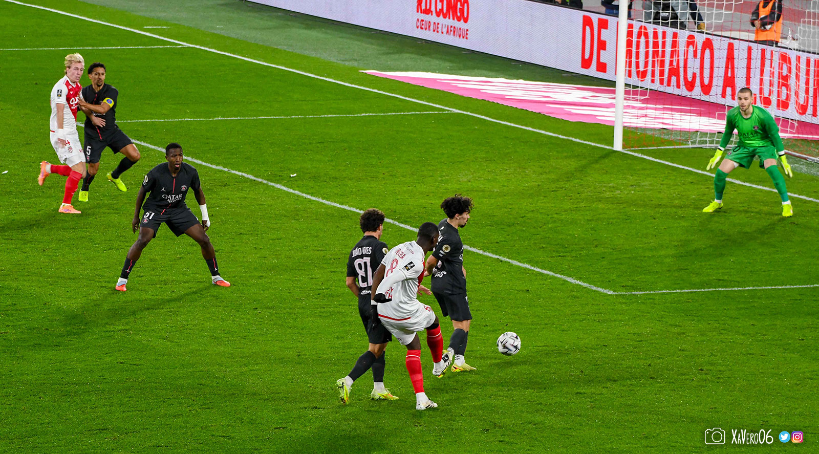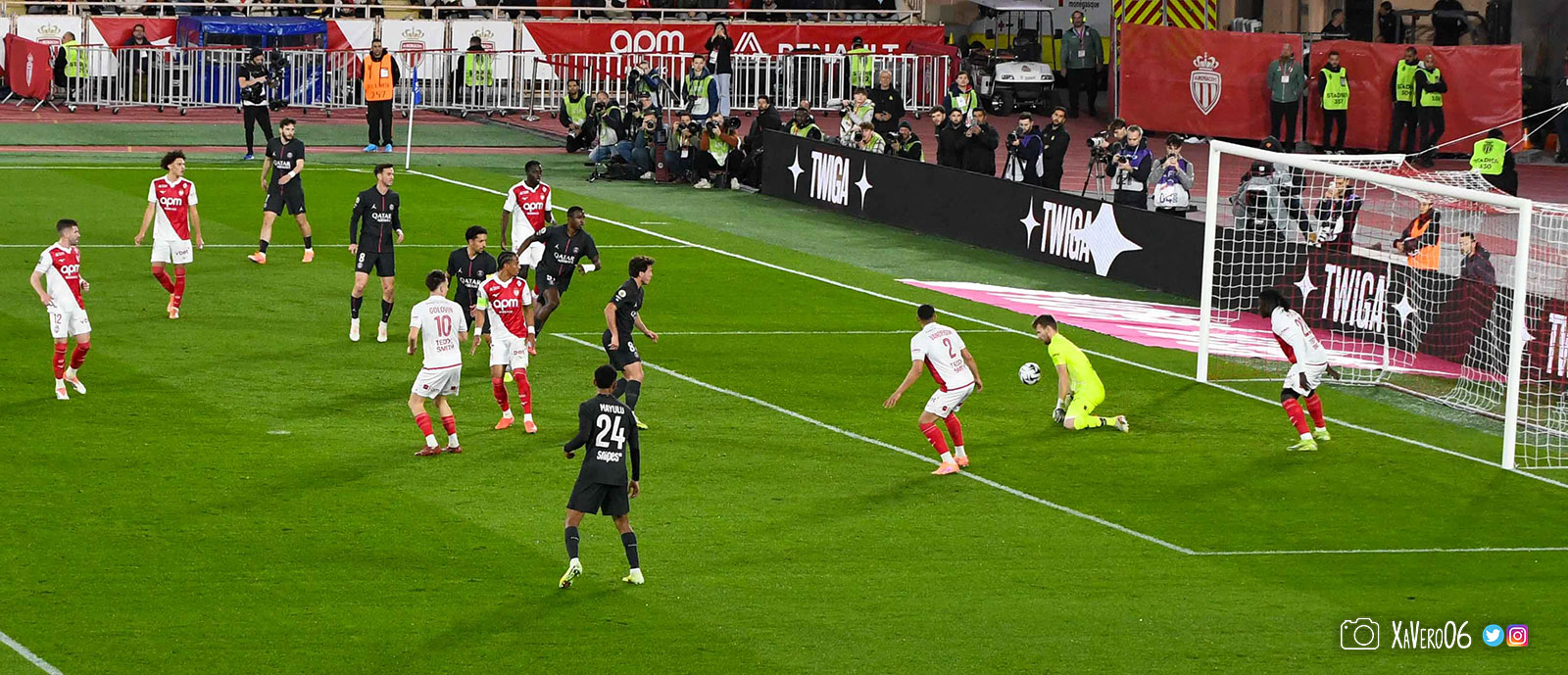 Le chemin vers l'avant est bouché, le ballon redescend jusqu'à Mohammed Salisu en défense côté gauche, qui envoit un long ballon dans la profondeur et le dos de Zaïre-Emery pour Aleksandr Golovin, qui lêve la tête avant de centrer à l'angle gauche de la surface. Son ballon piqué arrive sur Takumi Minamino aux 16m qui contrôle de la cuisse droite et reprend de demi-volée du pied gauche entre Pacho et Marquinhos. Le ballon n'est pas puissant, mais placé et roule au ras du poteau gauche de Chevalier, masqué au départ par ses deux centraux et peut-être par Balogun, nettement hors-jeu au moment de la frappe. Le ballon lui est passé à côté des pieds, les arbitres sur le terrain et à la V.A.R. ne disent rien, les parisiens ne protestent pas, l'AS Monaco prend l'avantage (1-0, 68e).