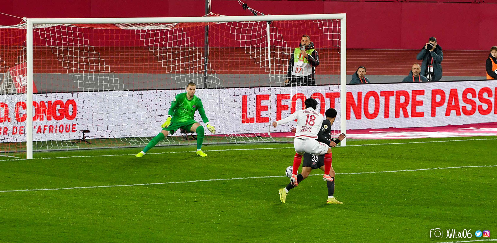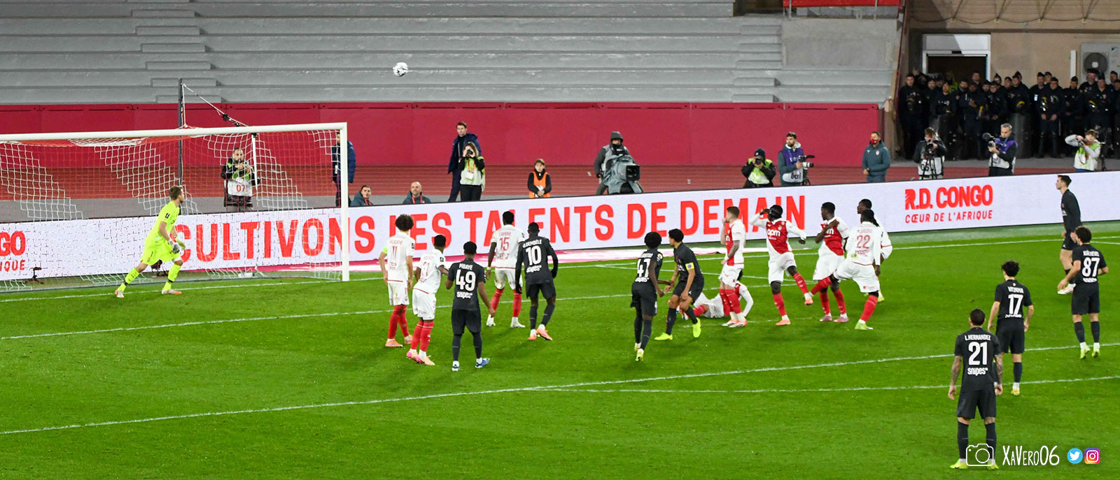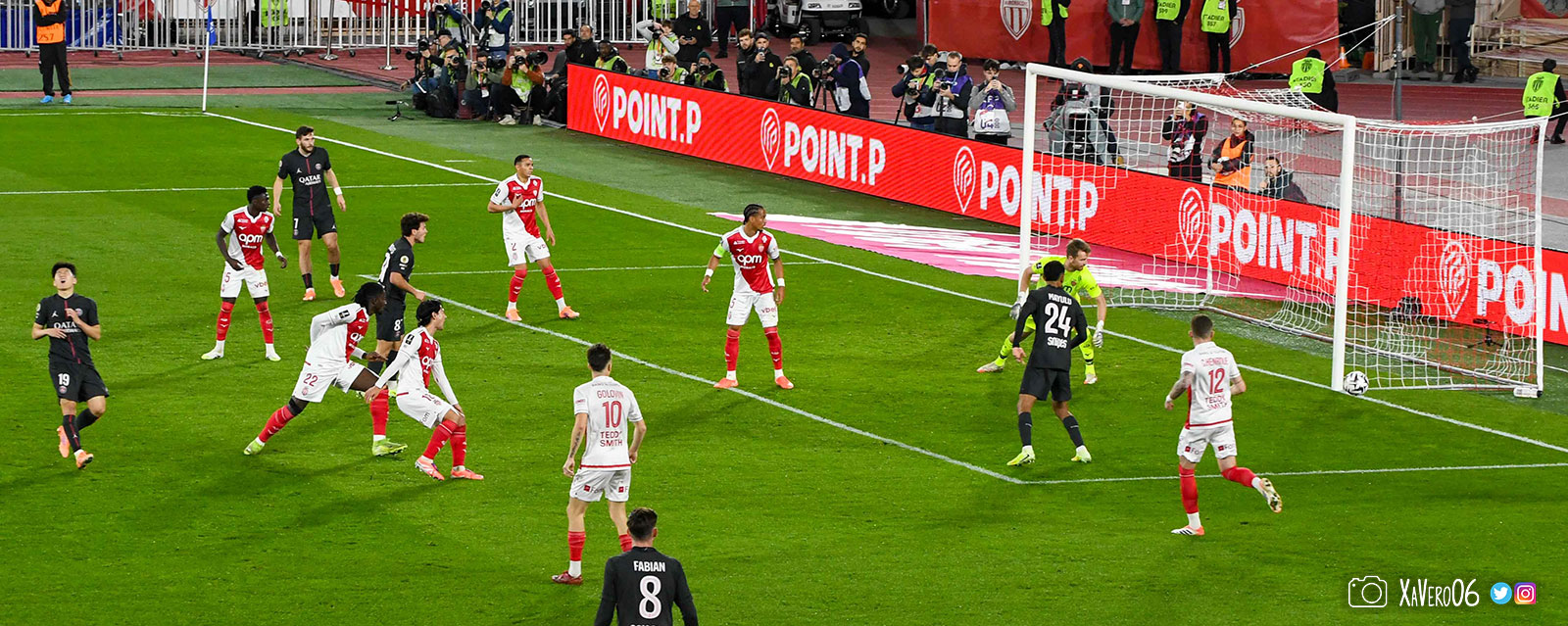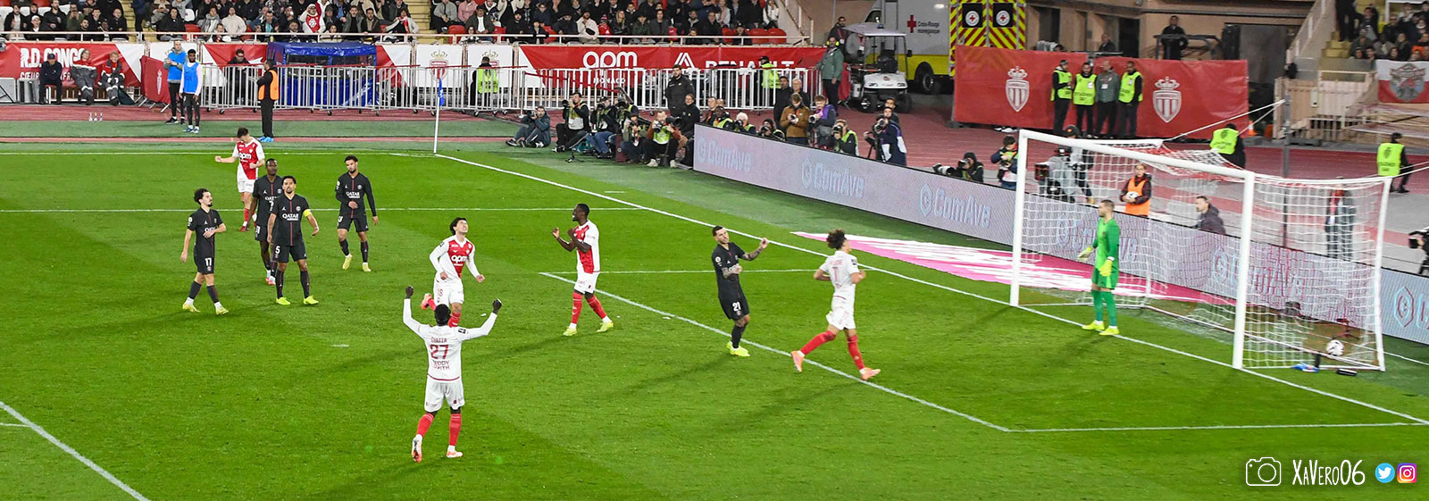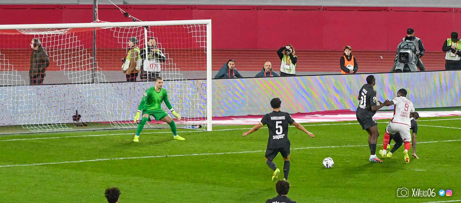 Le chemin vers l'avant est bouché, le ballon redescend jusqu'à Mohammed Salisu en défense côté gauche, qui envoit un long ballon dans la profondeur et le dos de Zaïre-Emery pour Aleksandr Golovin, qui lêve la tête avant de centrer à l'angle gauche de la surface. Son ballon piqué arrive sur Takumi Minamino aux 16m qui contrôle de la cuisse droite et reprend de demi-volée du pied gauche entre Pacho et Marquinhos. Le ballon n'est pas puissant, mais placé et roule au ras du poteau gauche de Chevalier, masqué au départ par ses deux centraux et peut-être par Balogun, nettement hors-jeu au moment de la frappe. Le ballon lui est passé à côté des pieds, les arbitres sur le terrain et à la V.A.R. ne disent rien, les parisiens ne protestent pas, l'AS Monaco prend l'avantage (1-0, 68e).
