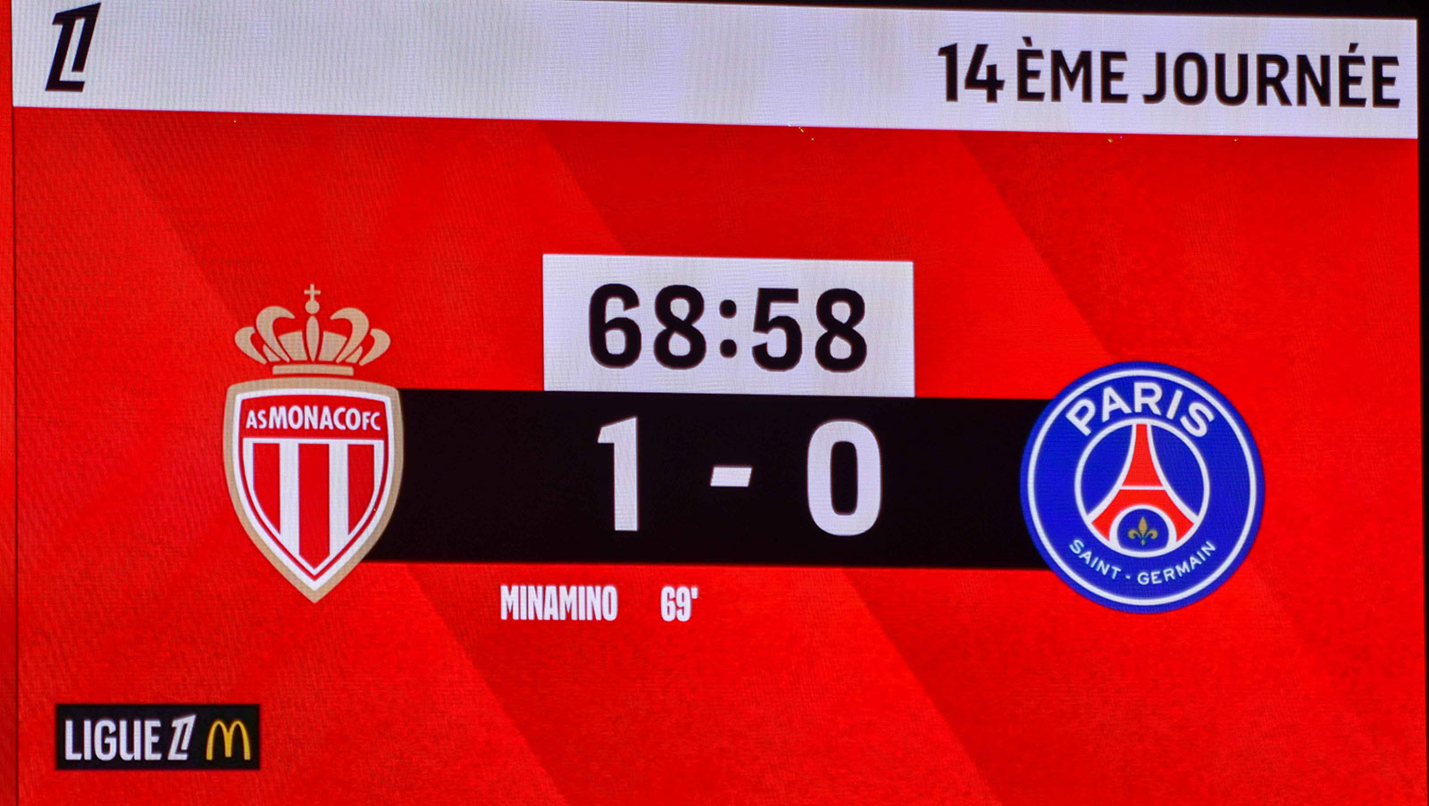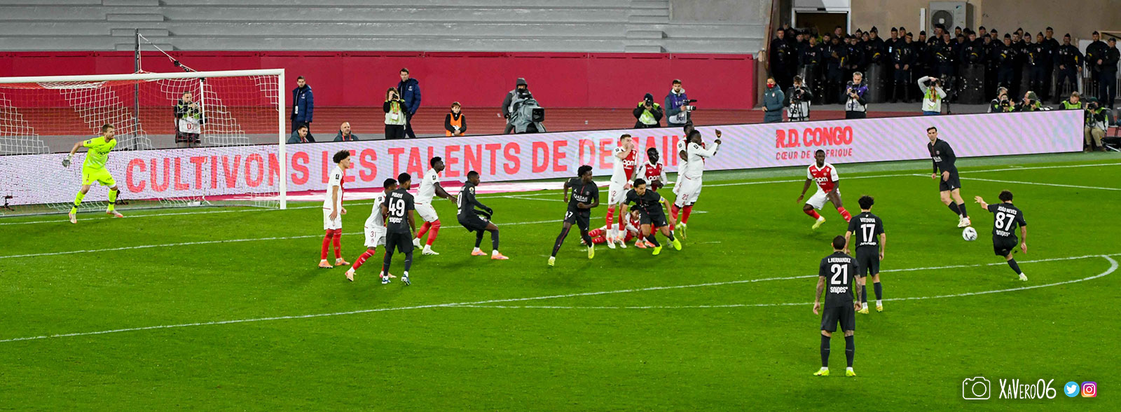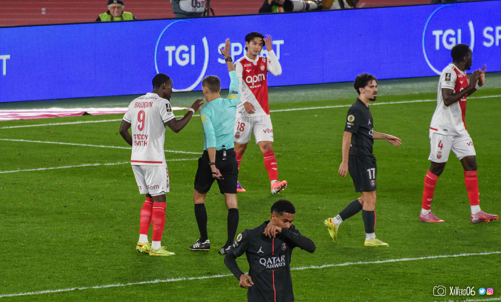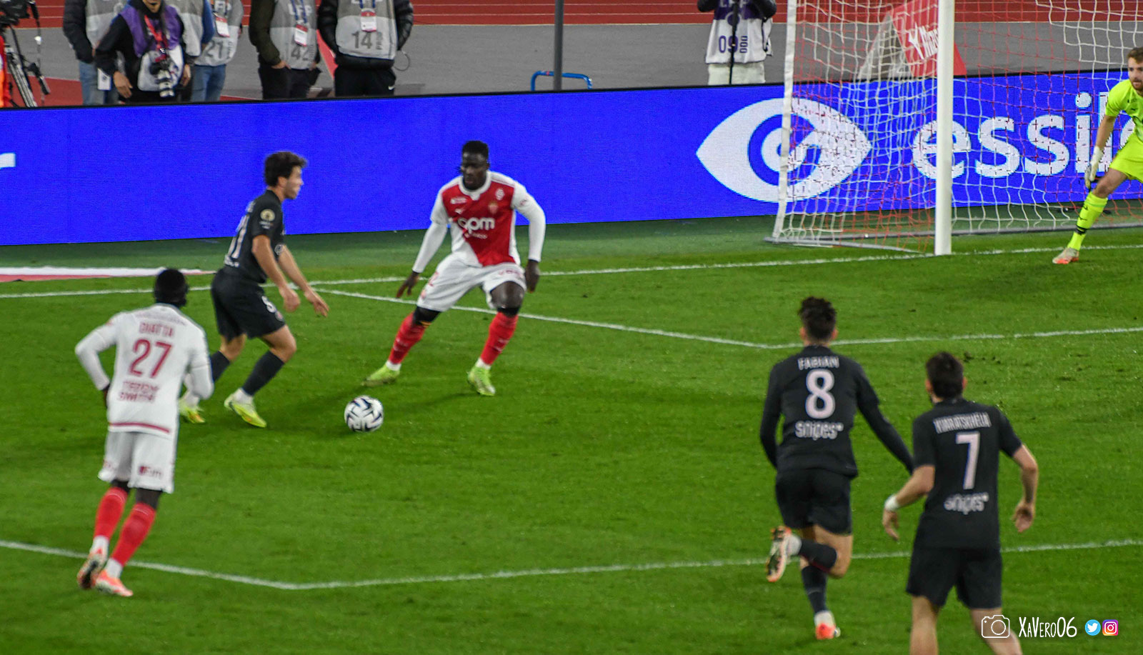 Le chemin vers l'avant est bouché, le ballon redescend jusqu'à Mohammed Salisu en défense côté gauche, qui envoit un long ballon dans la profondeur et le dos de Zaïre-Emery pour Aleksandr Golovin, qui lêve la tête avant de centrer à l'angle gauche de la surface. Son ballon piqué arrive sur Takumi Minamino aux 16m qui contrôle de la cuisse droite et reprend de demi-volée du pied gauche entre Pacho et Marquinhos. Le ballon n'est pas puissant, mais placé et roule au ras du poteau gauche de Chevalier, masqué au départ par ses deux centraux et peut-être par Balogun, nettement hors-jeu au moment de la frappe. Le ballon lui est passé à côté des pieds, les arbitres sur le terrain et à la V.A.R. ne disent rien, les parisiens ne protestent pas, l'AS Monaco prend l'avantage (1-0, 68e).