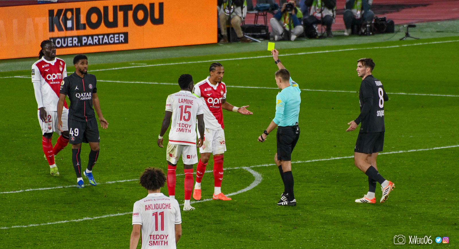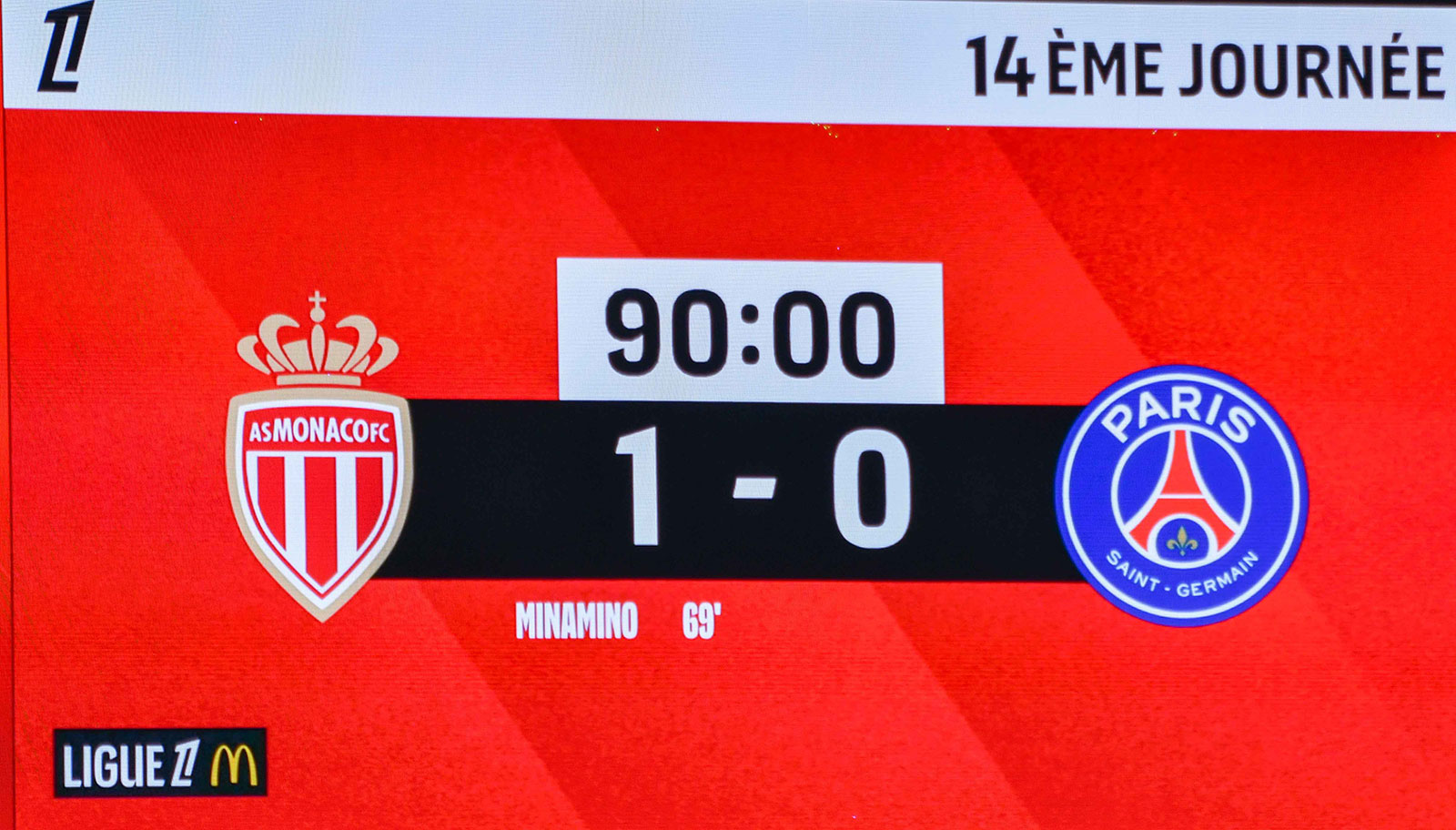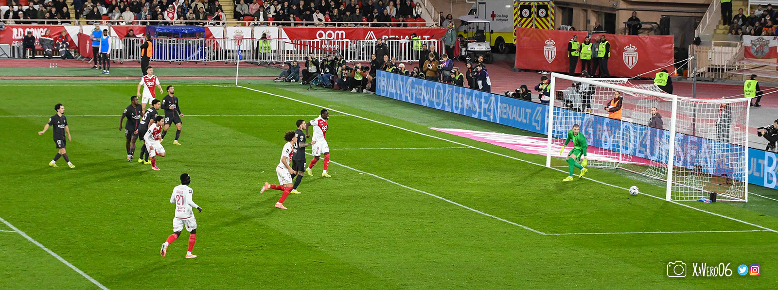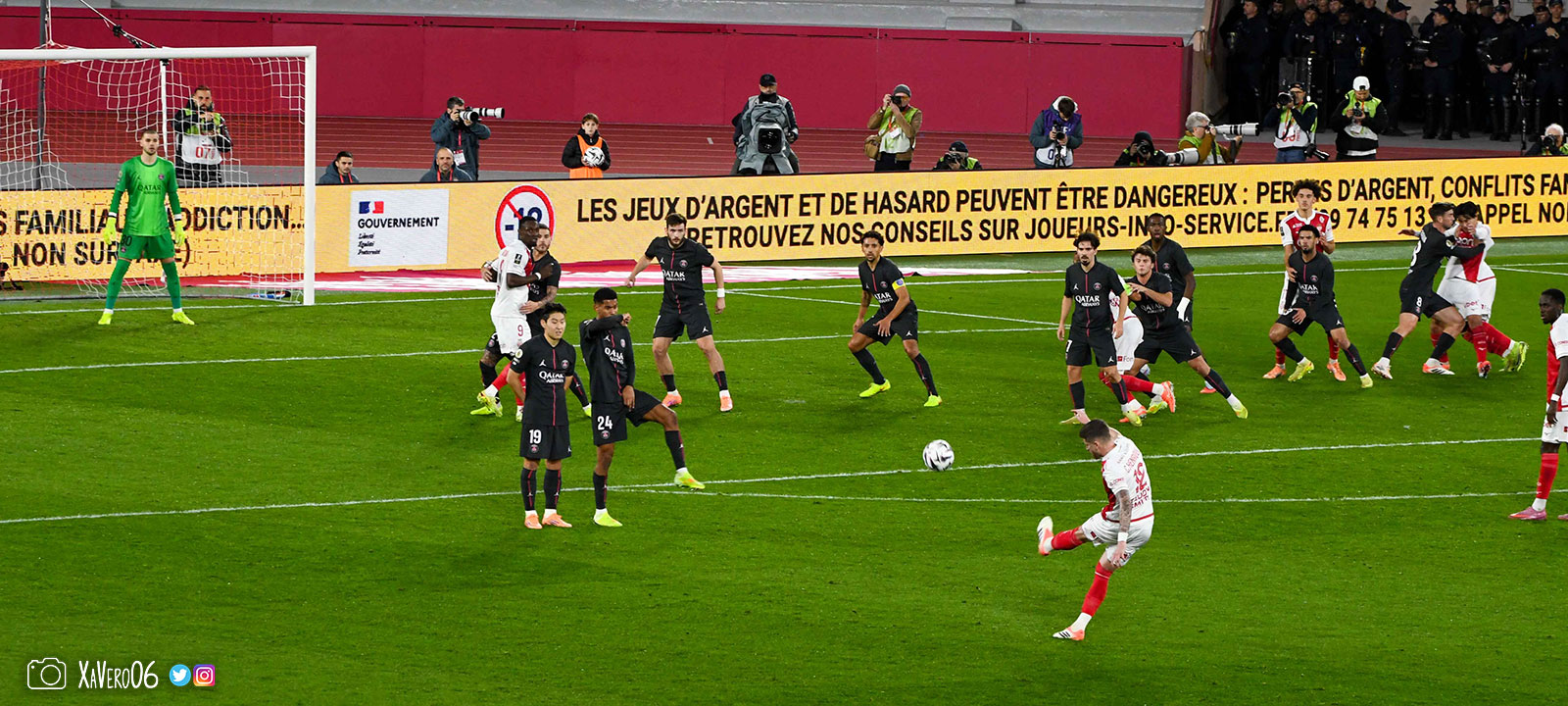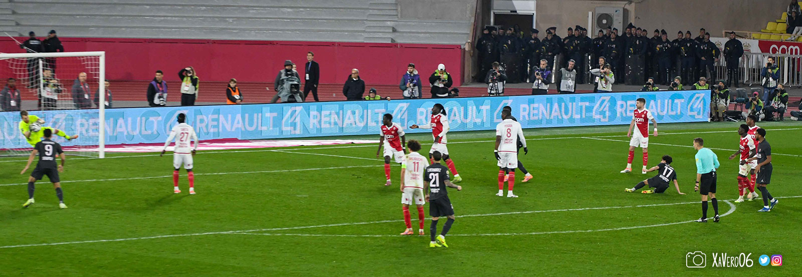 Le chemin vers l'avant est bouché, le ballon redescend jusqu'à Mohammed Salisu en défense côté gauche, qui envoit un long ballon dans la profondeur et le dos de Zaïre-Emery pour Aleksandr Golovin, qui lêve la tête avant de centrer à l'angle gauche de la surface. Son ballon piqué arrive sur Takumi Minamino aux 16m qui contrôle de la cuisse droite et reprend de demi-volée du pied gauche entre Pacho et Marquinhos. Le ballon n'est pas puissant, mais placé et roule au ras du poteau gauche de Chevalier, masqué au départ par ses deux centraux et peut-être par Balogun, nettement hors-jeu au moment de la frappe. Le ballon lui est passé à côté des pieds, les arbitres sur le terrain et à la V.A.R. ne disent rien, les parisiens ne protestent pas, l'AS Monaco prend l'avantage (1-0, 68e).