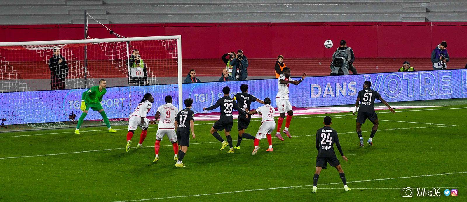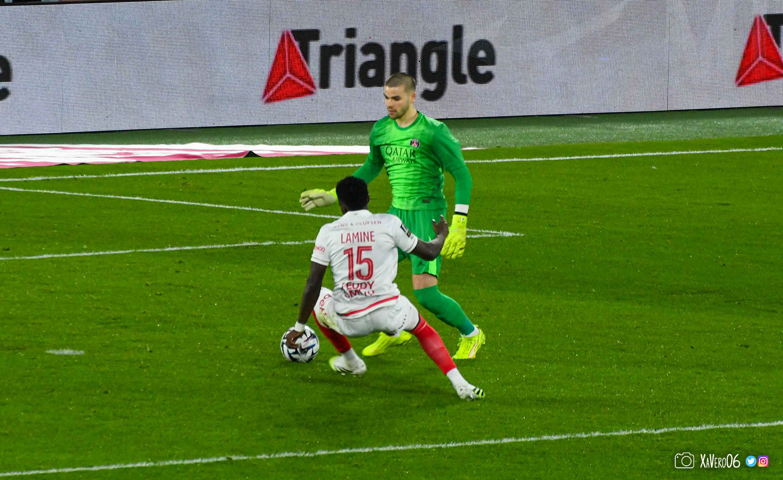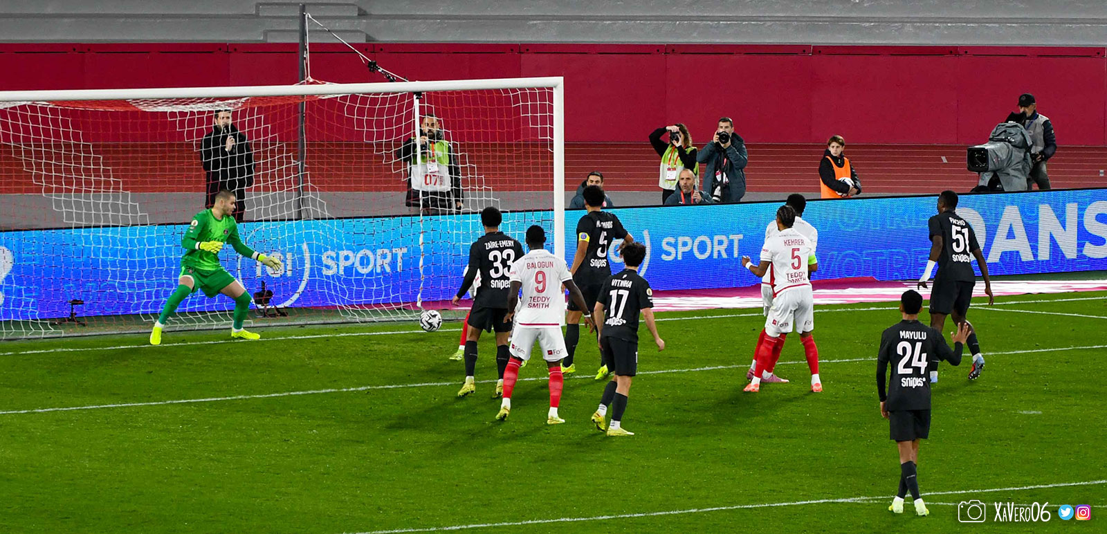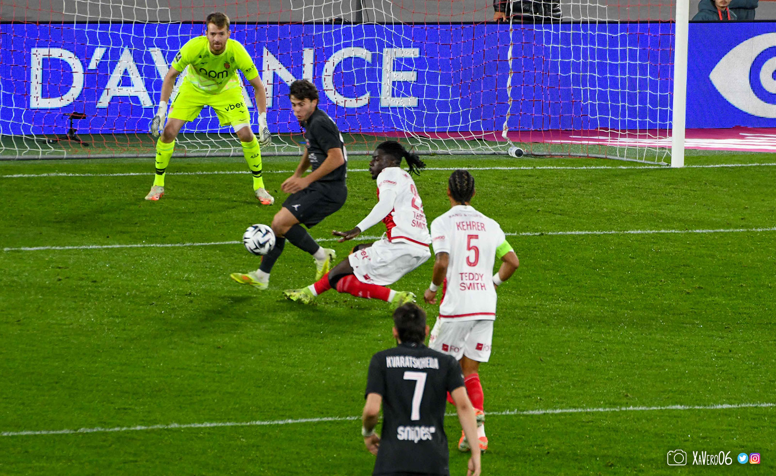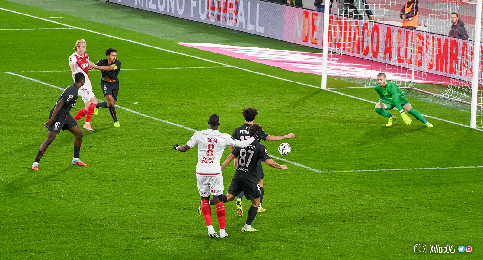 - Côté droit, Akliouche est bloqué par deux adversaires et parvient à donner sur Paul Pogba qui rentre dans la surface par l'angle droit, qui lève la tête et donne le ballon pour le premier poteau où Mika Biereth ne s'est pas jeté. Chevalier se couche et capte (90e+4).