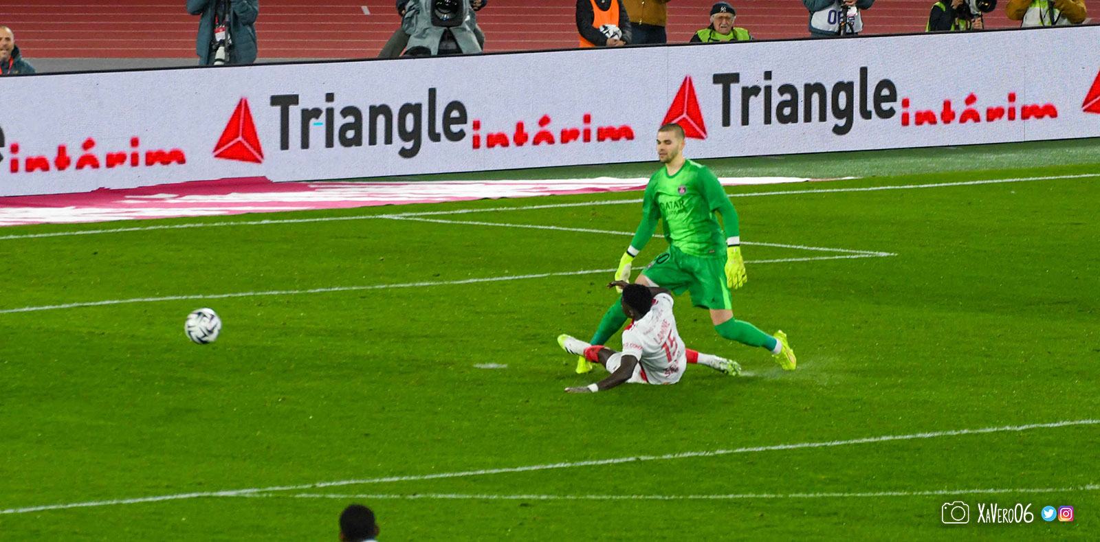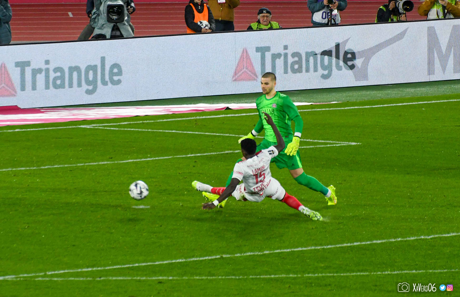 Paris fait tourner le ballon, jusqu'à son gardien qui attend jusqu'au dernier moment pour faire la passe. Il est taclé par Lamine Camara venu au pressing, qui lui prend le pied d'appui à hauteur de la cheville.