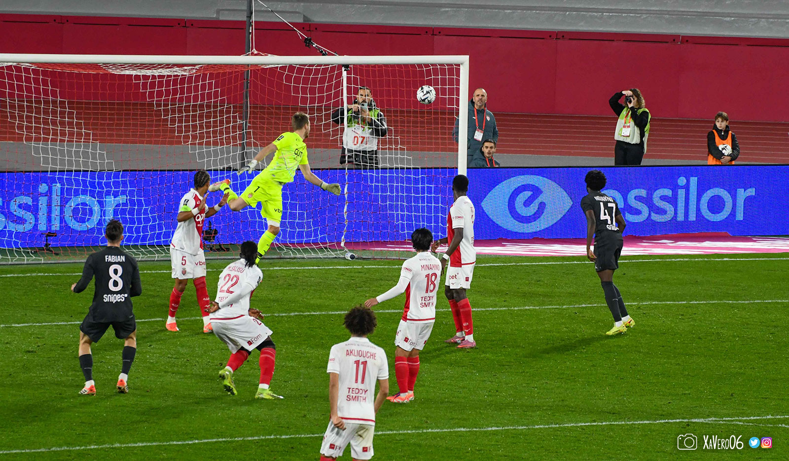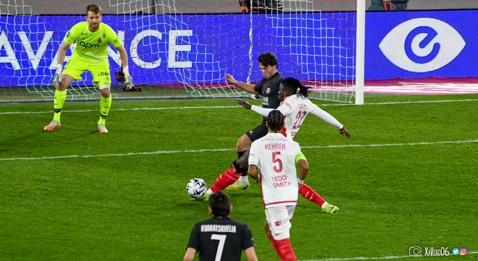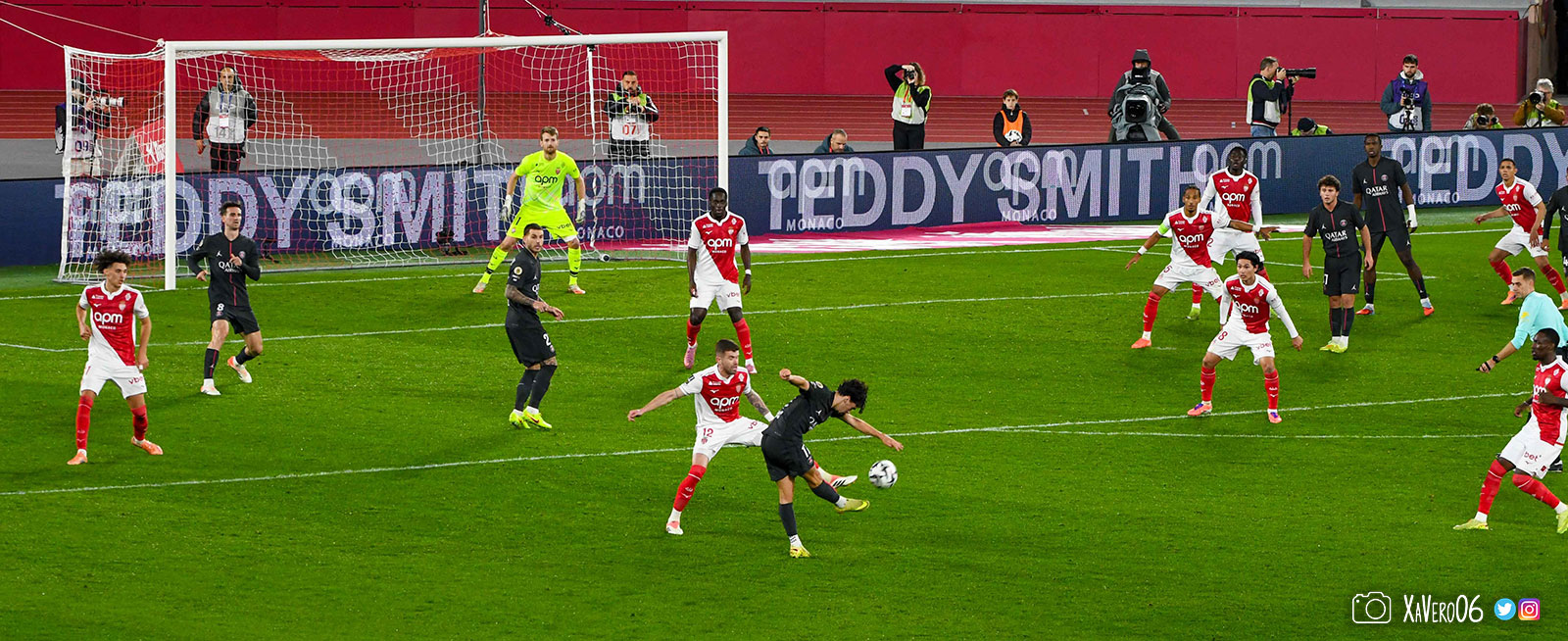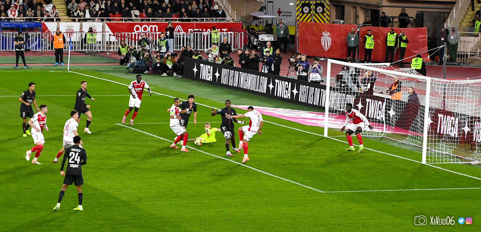 Lee et Hernandez jouent le corner à 2, Lee joue avec Kvaratskhelia dans la surface proche de la ligne de sortie de but qui remet en retrait. Ruiz laisse passer pour Lee dans le sens du jeu, qui remet encore en retrait pour Vitinha dans l'axe aux 18m. Sa frappe puissante est repoussé par Hrádecký aux 6m, Pacho qui passait par là détourne le ballon et la défense monégasque dégage (26e).