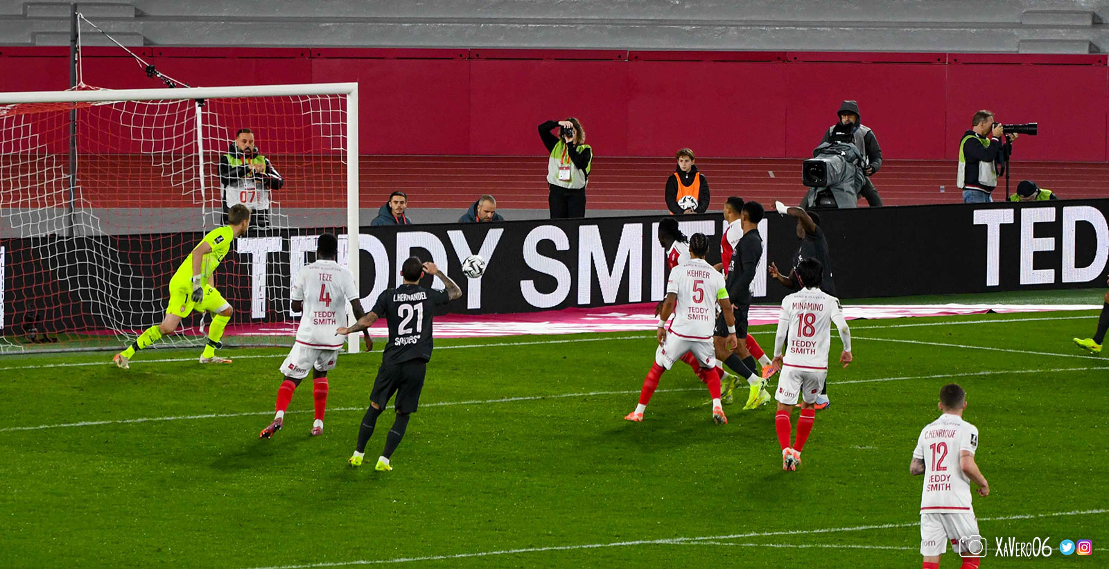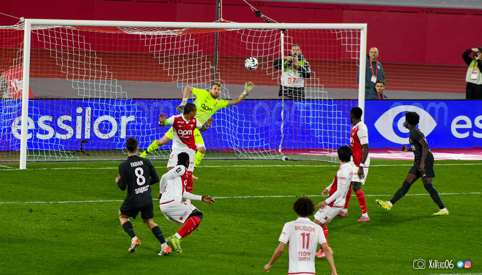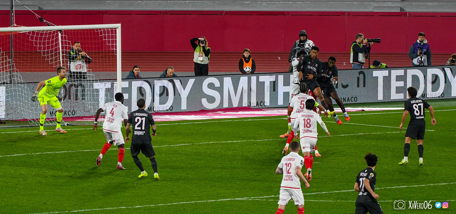Lee et Hernandez jouent le corner à 2, Lee joue avec Kvaratskhelia dans la surface proche de la ligne de sortie de but qui remet en retrait. Ruiz laisse passer pour Lee dans le sens du jeu, qui remet encore en retrait pour Vitinha dans l'axe aux 18m. Sa frappe puissante est repoussé par Hrádecký aux 6m, Pacho qui passait par là détourne le ballon et la défense monégasque dégage (26e).