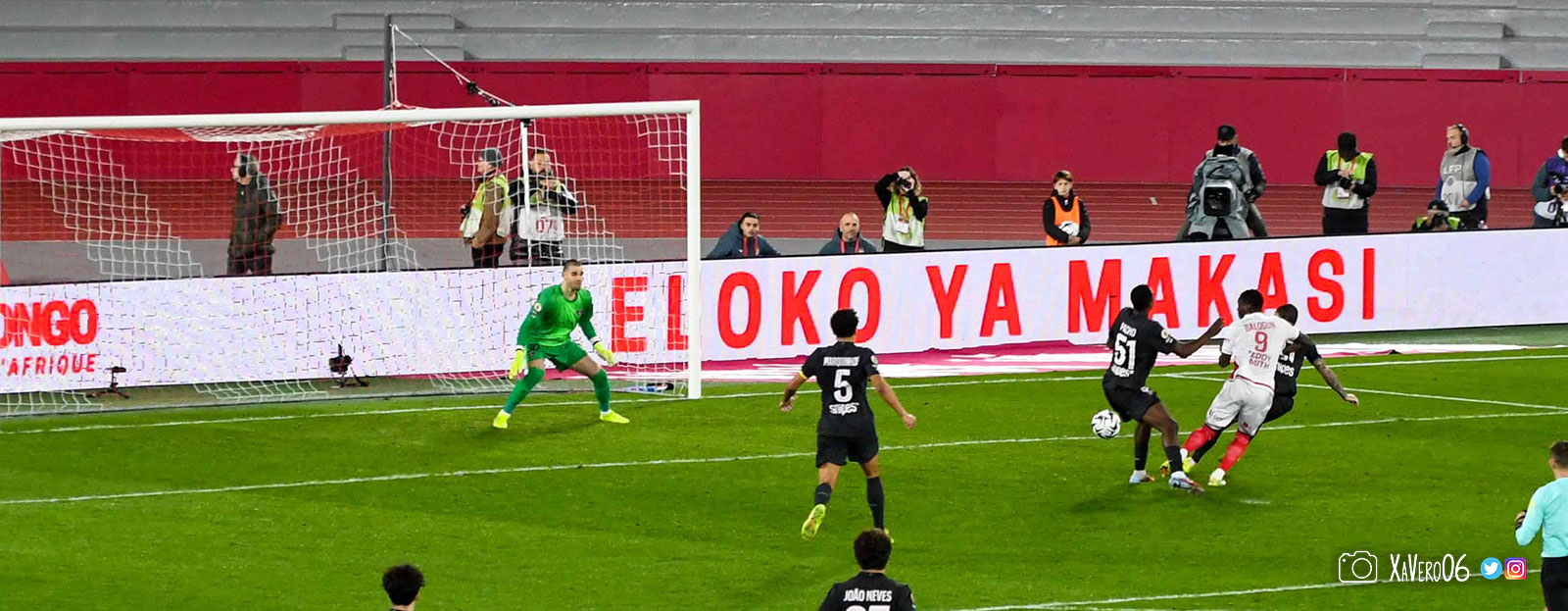 Sur le corner joué en retrait, le centre de Vitinha trouve la tête de Mayulu aux 6m, qui pas juste à côté (55e).