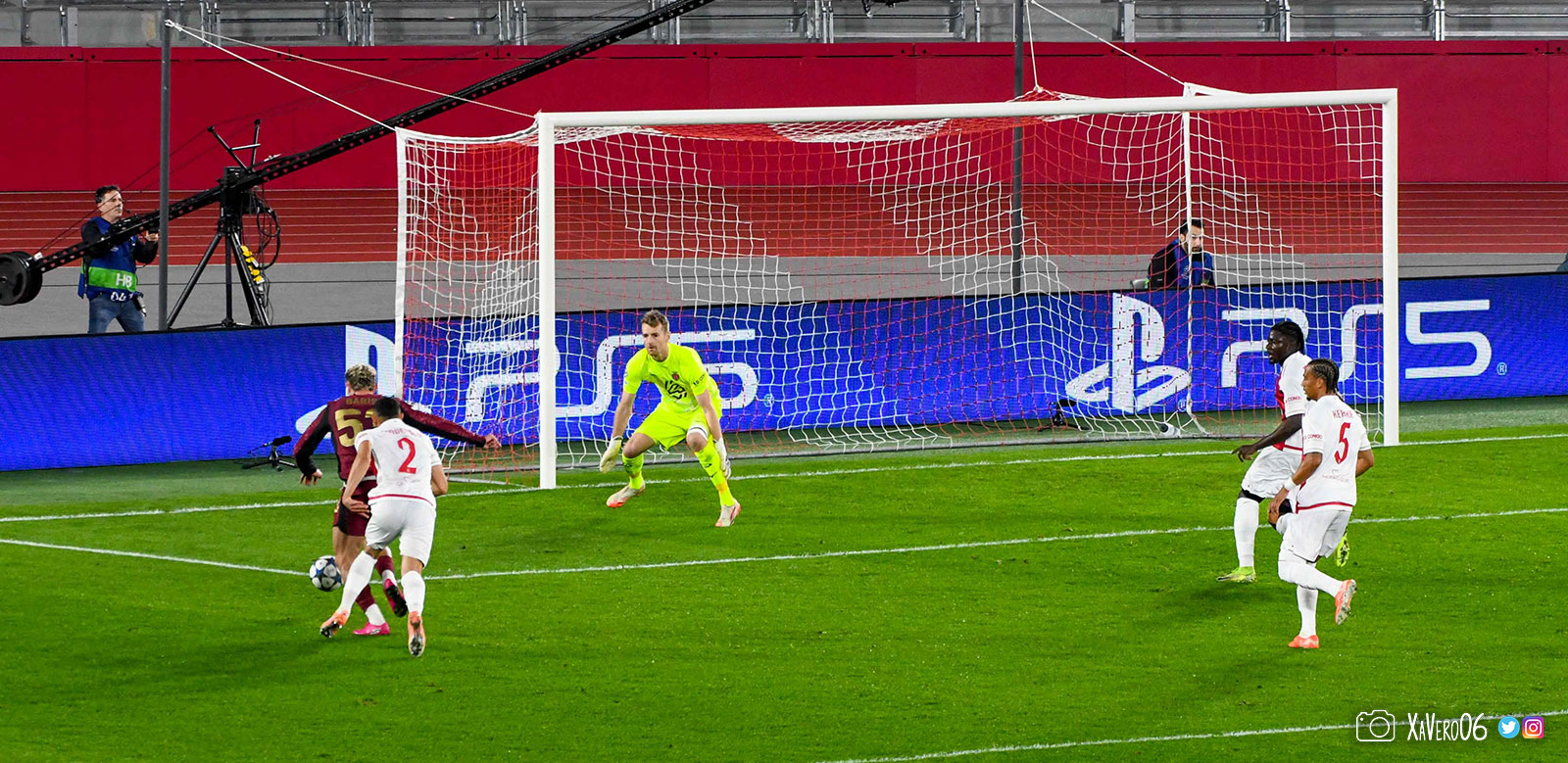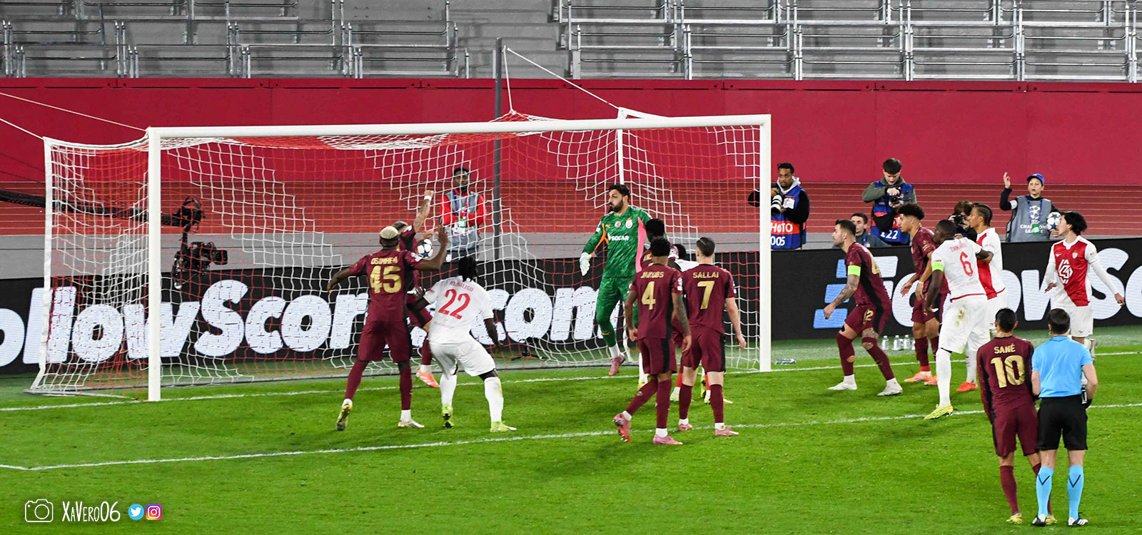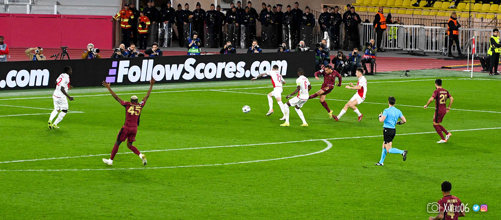 Sur le 6m, les turcs tentent de repartir côté droit et se font prendre le ballon aux 30m par le pressing de l'ASM. Golovin joue vite pour Akliouche aux 25m qui dévie dans la course de Minamino sur la gauche de la surface qui contrôle et centre parfaitement pour Folarin Balogun, seul aux 6m au premier poteau qui reprend mais tire à côté (59e).