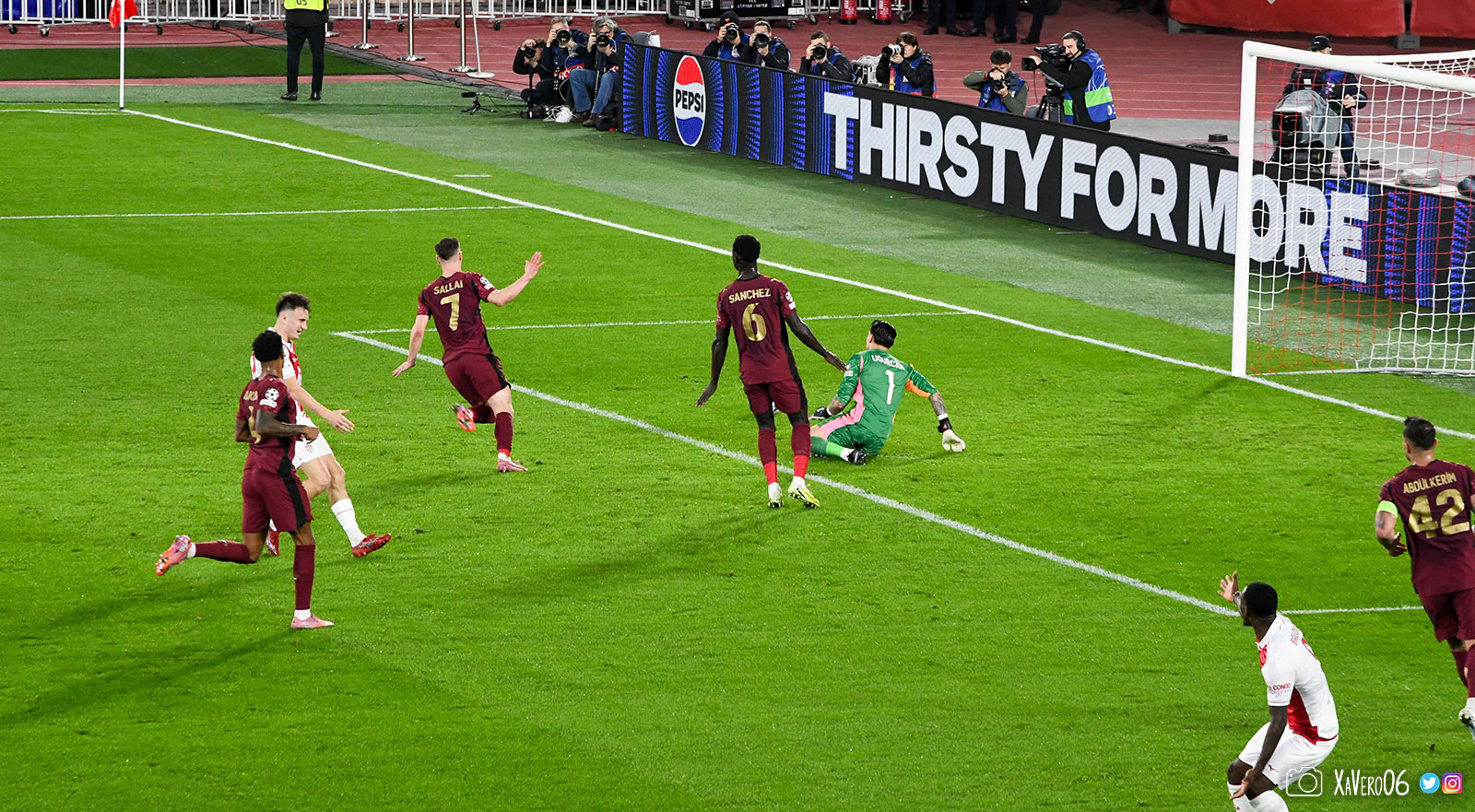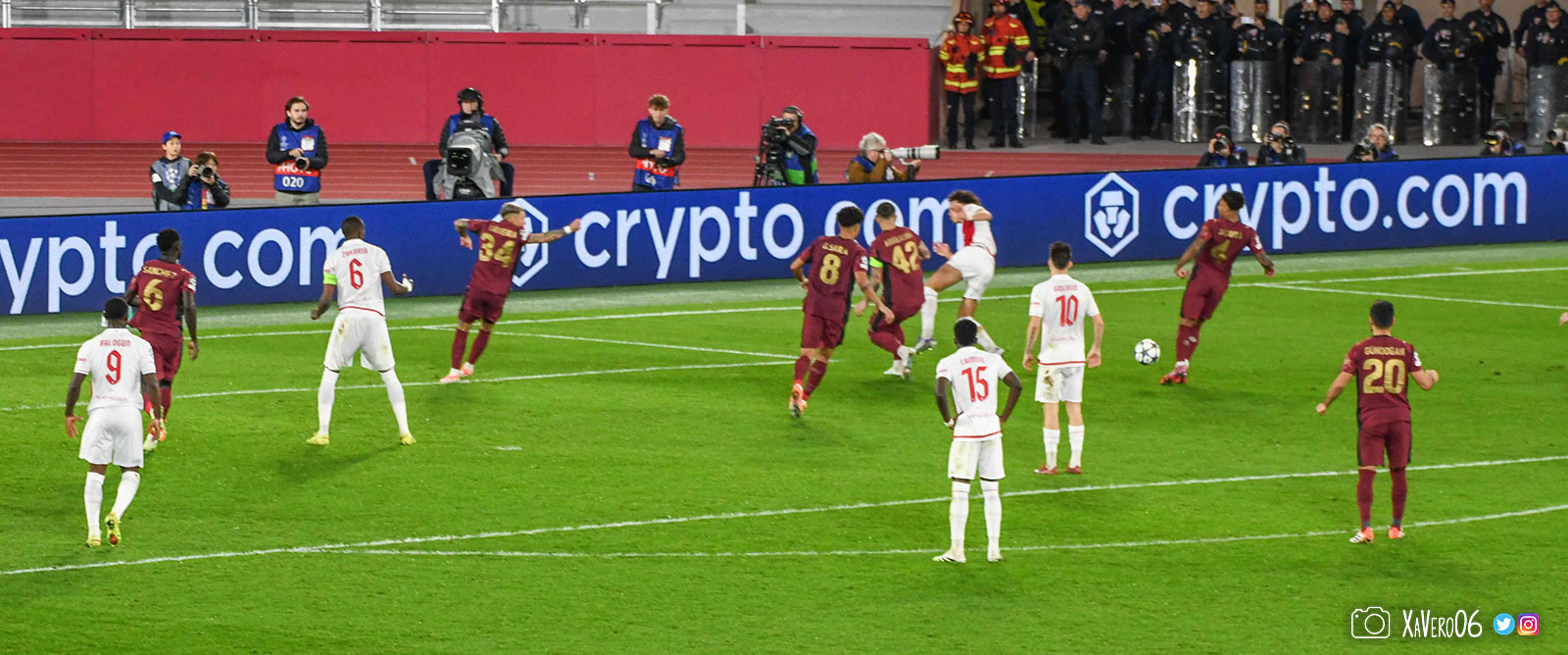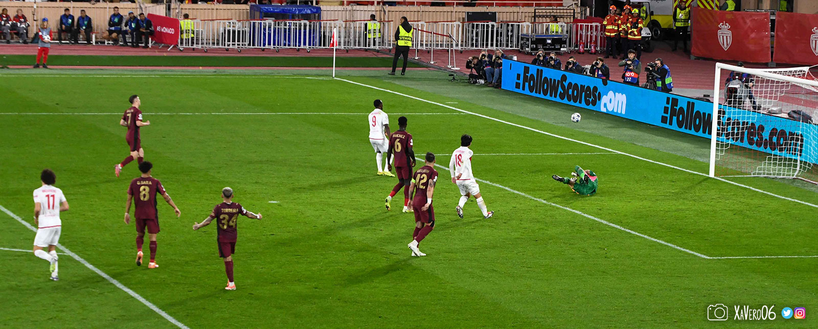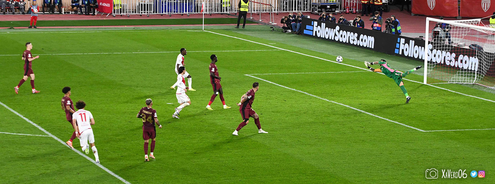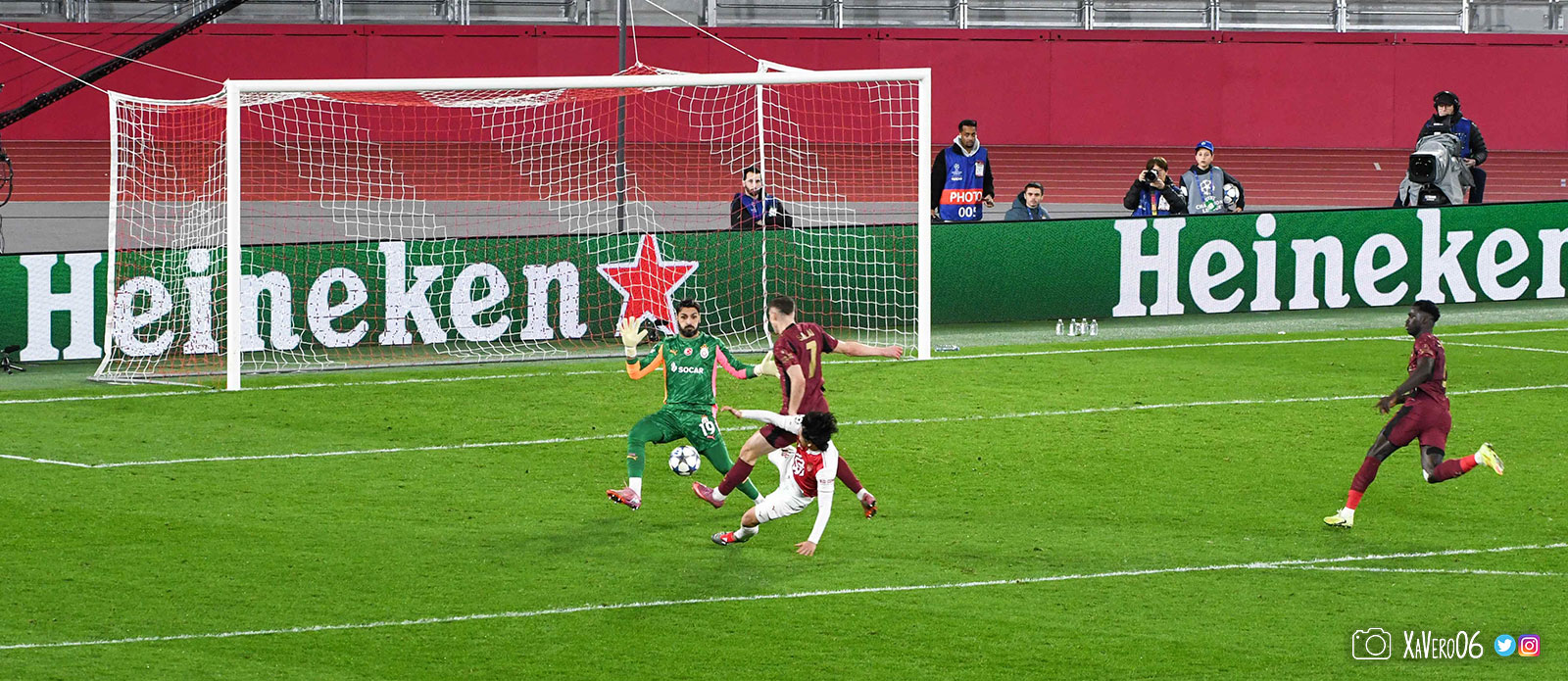 Pressing monégasque payant aux 30m, Vanderson est trouvé à droite et centre immédiatement pour le point de pénalty au-dessus de Sánchez, pour la volée du plat du pied gauche de Takumi Minamino. Çakir repousse devant lui, sur Minamino qui contrôle, passe devant Sánchez qui en voulant dégager tape dans la jambe du japonais qui s'est positionné devant lui (48e).