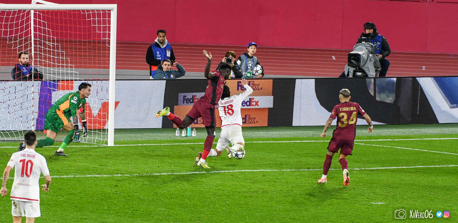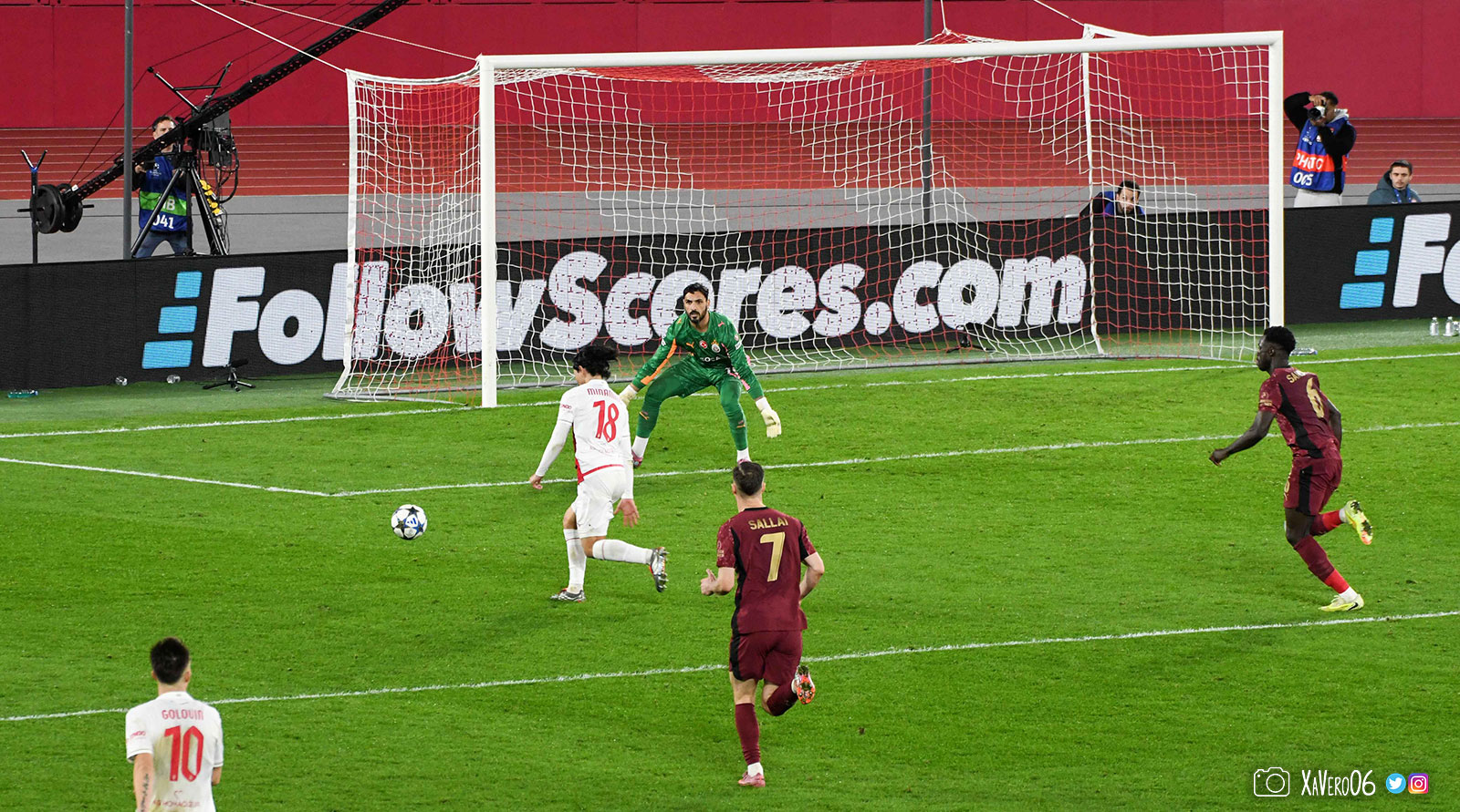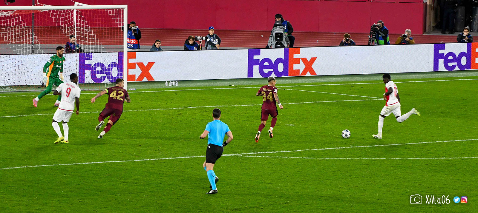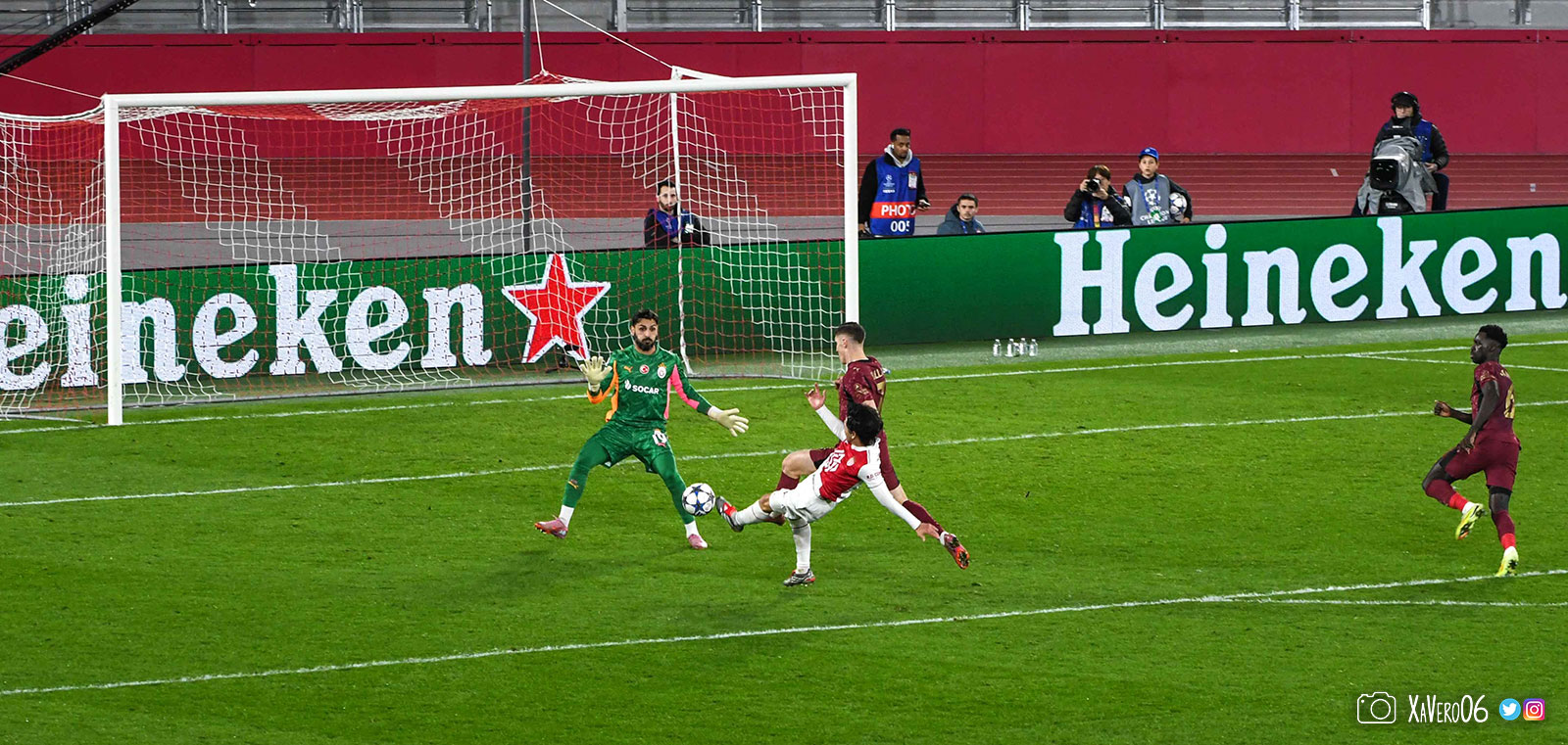 Pressing monégasque payant aux 30m, Vanderson est trouvé à droite et centre immédiatement pour le point de pénalty au-dessus de Sánchez, pour la volée du plat du pied gauche de Takumi Minamino. Çakir repousse devant lui, sur Minamino qui contrôle, passe devant Sánchez qui en voulant dégager tape dans la jambe du japonais qui s'est positionné devant lui (48e).