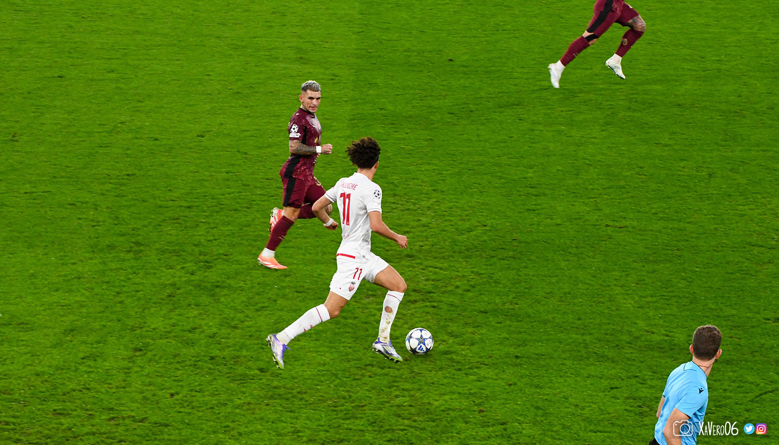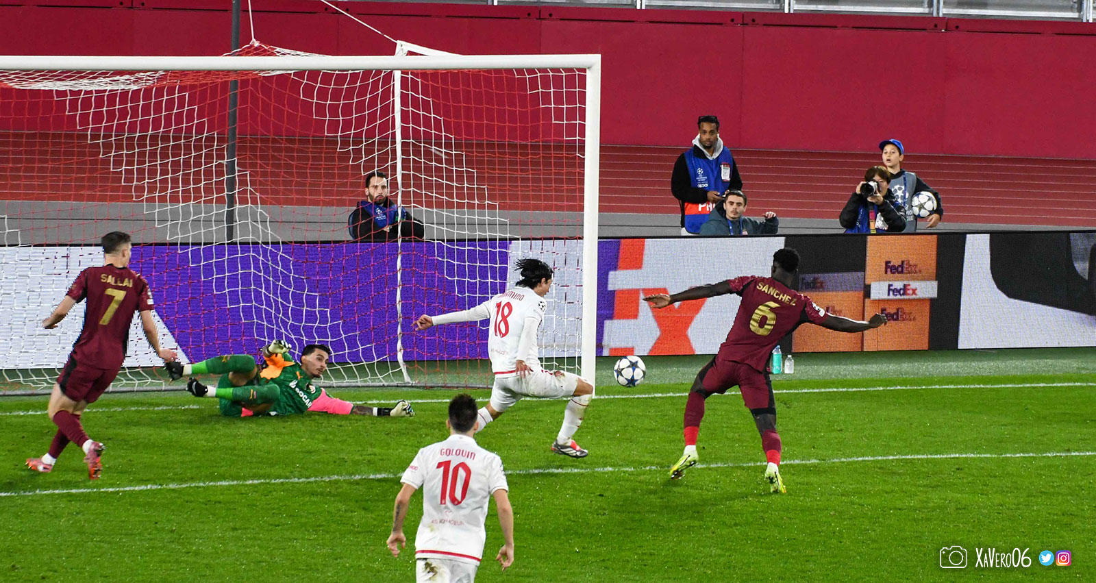 - Longue balle en profondeur d'Akliouche pour Takumi Minamino dans l'axe, entre Sánchez et Sallai, qui n'arrive pas à frapper en déséquilibre (72e).