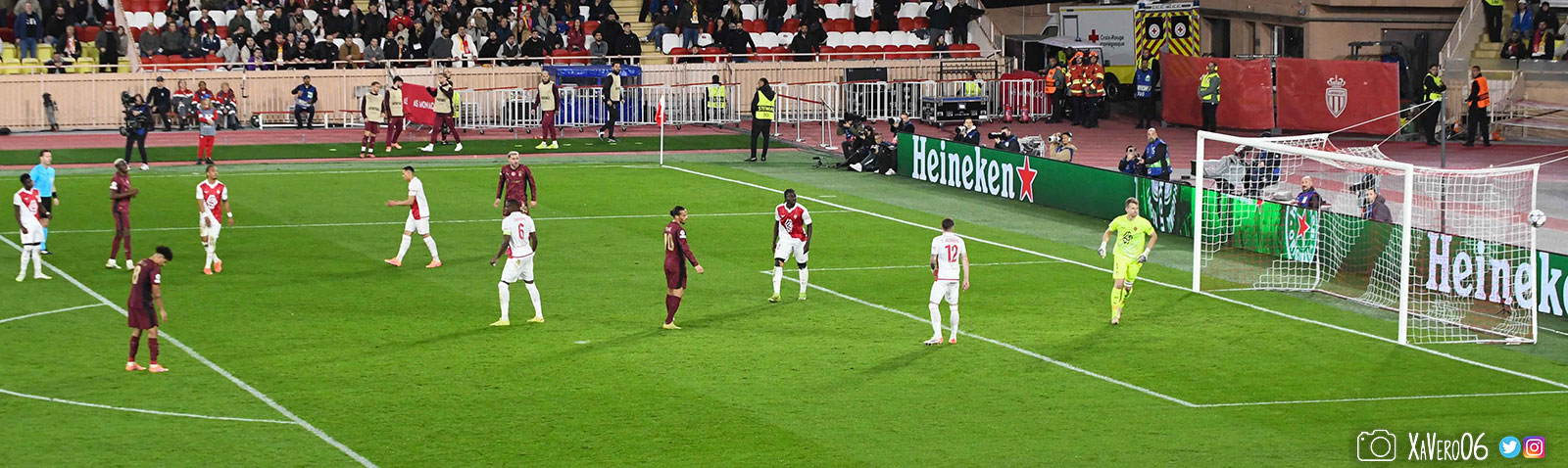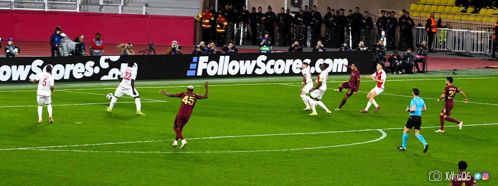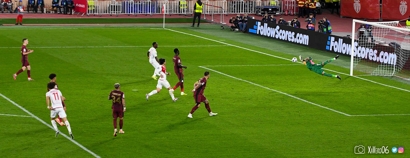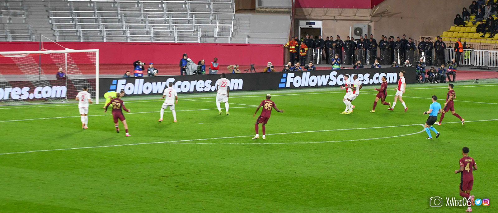 Monaco récupère encore le ballon dans son camp avec Camara le long de la touche à hauteur de la ligne médiane qui envoit un long ballon pour Minamino qui met d'une tête polongeante dans la course de Folarin Balogun dans l'axe, qui prend Bardakci de vitesse et frappe en force... de peu au-dessus (62e).