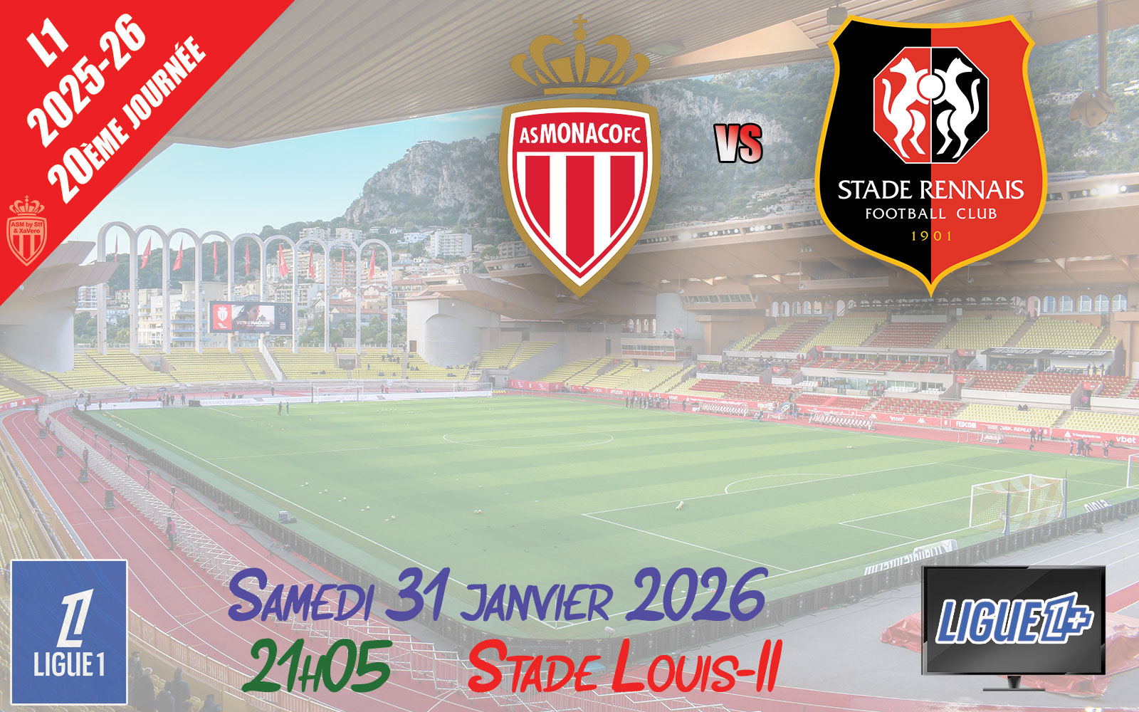 Pour la 20ème journée de Ligue 1, l'AS Monaco (10ème) reçoit le Stade Rennais (6ème).