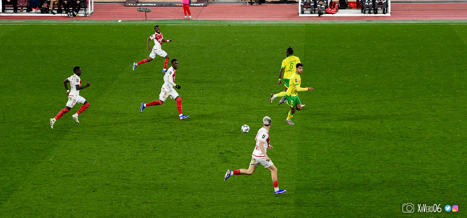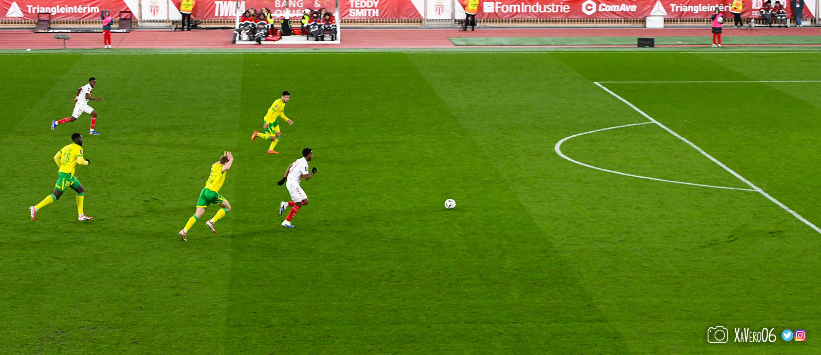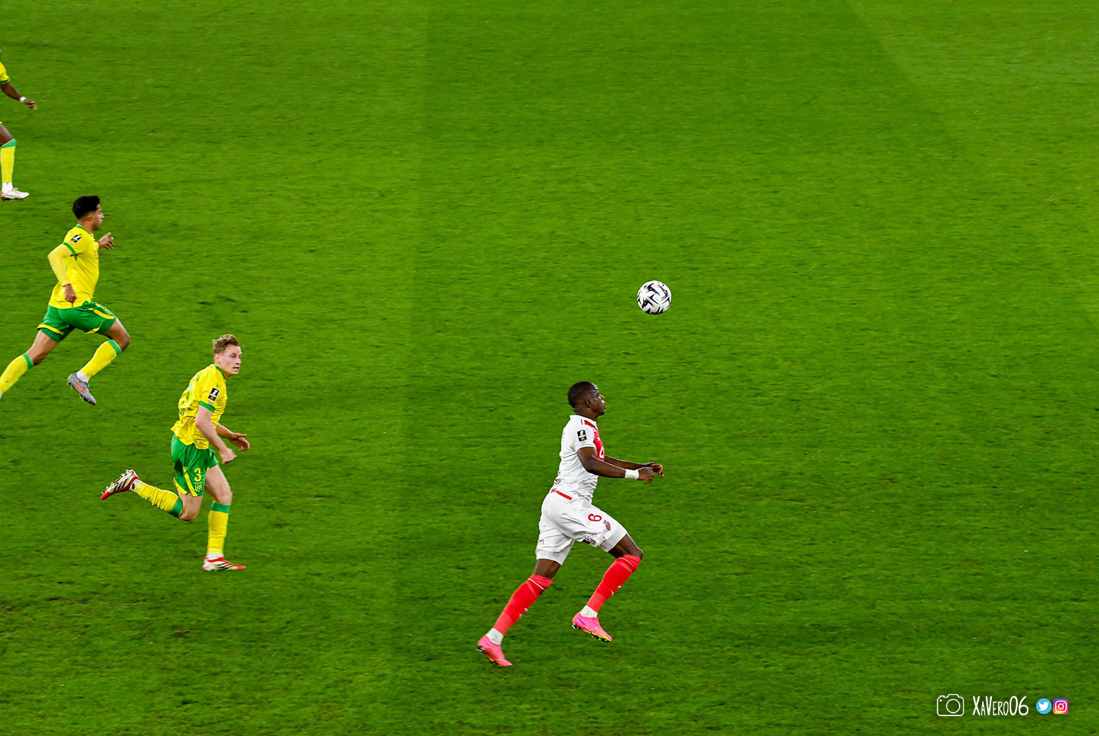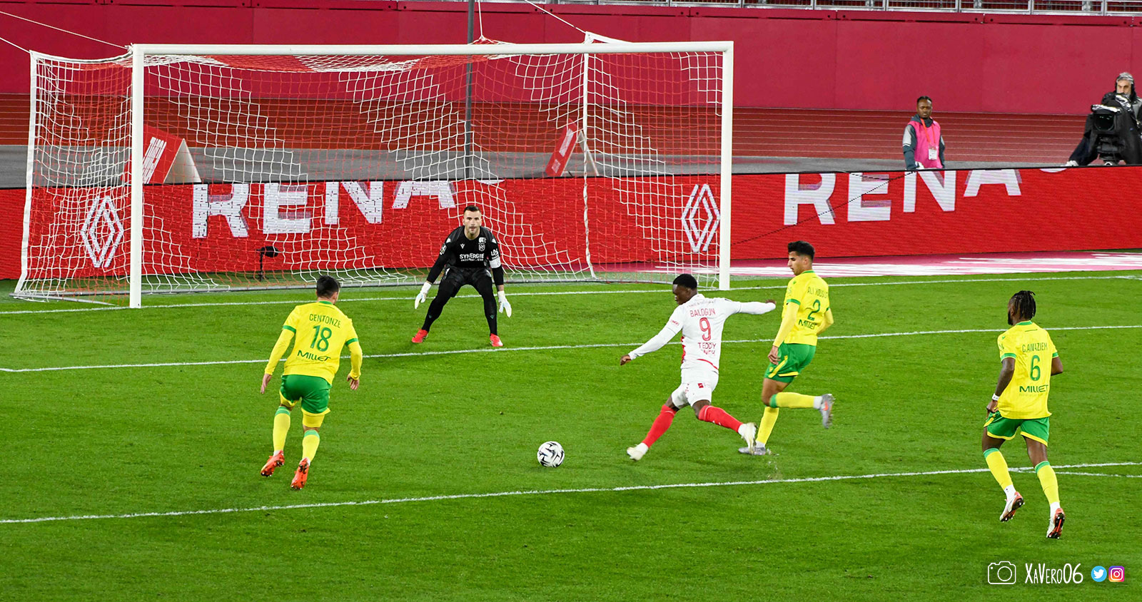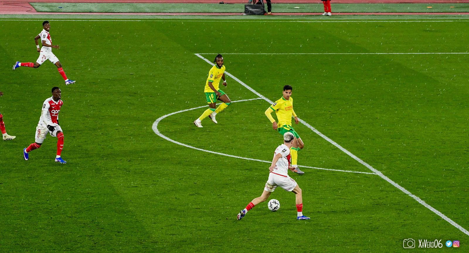 Nantes est encore gêné par le pressing et met en retrait pour sa défense aux 35m. Yousuf cherche Coquelin dans le rond central, pressé par Zakaria, qui pousse le ballon sur Golovin entre le passeur et le receveur, qui se retourne pour lancer un contre à 5 contre 2, avec Akliouche et Balogun à droite, le capitaine de l'ASM et le double buteur à gauche, avec Sylla et Yousuf au milieu.