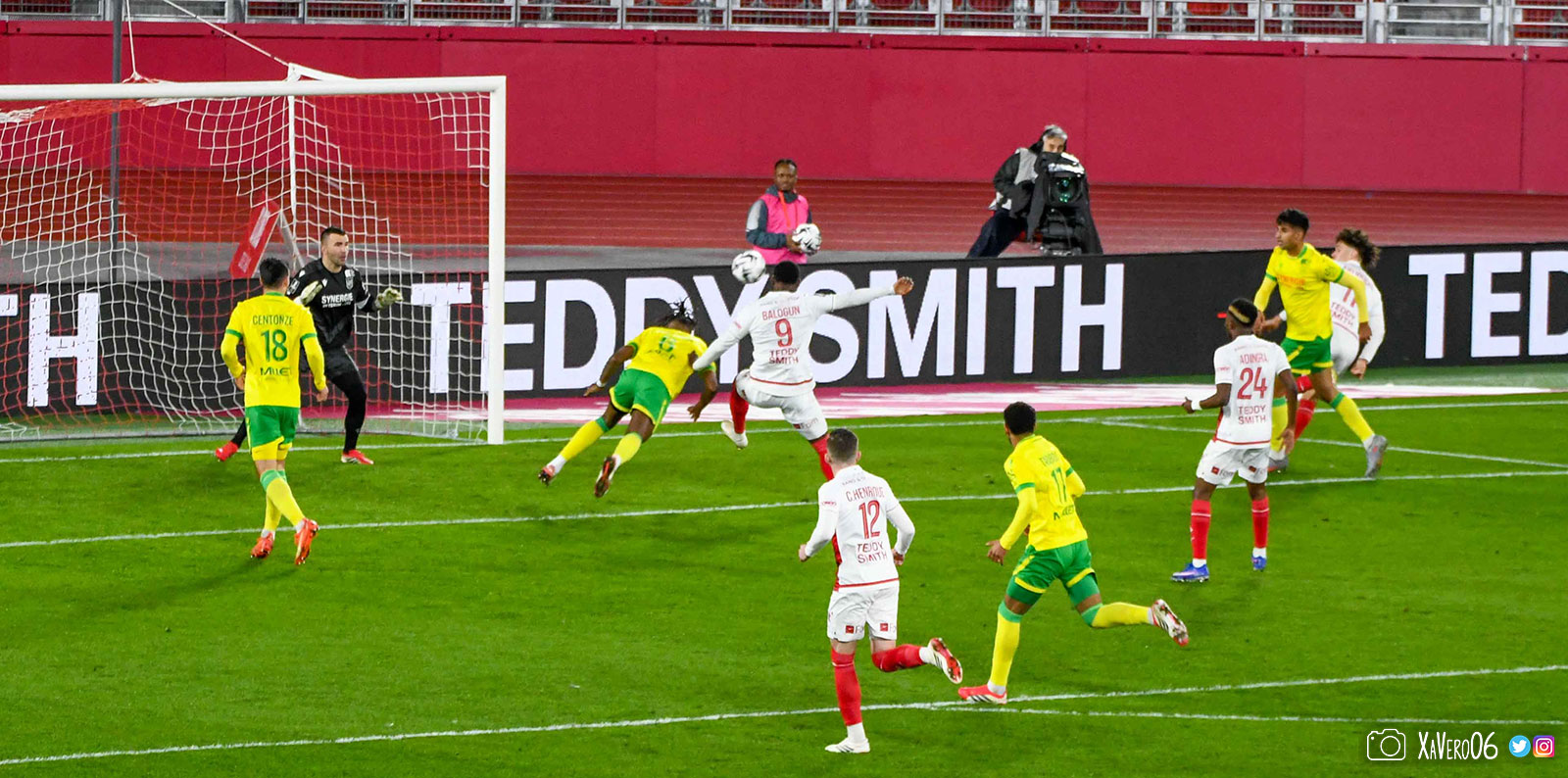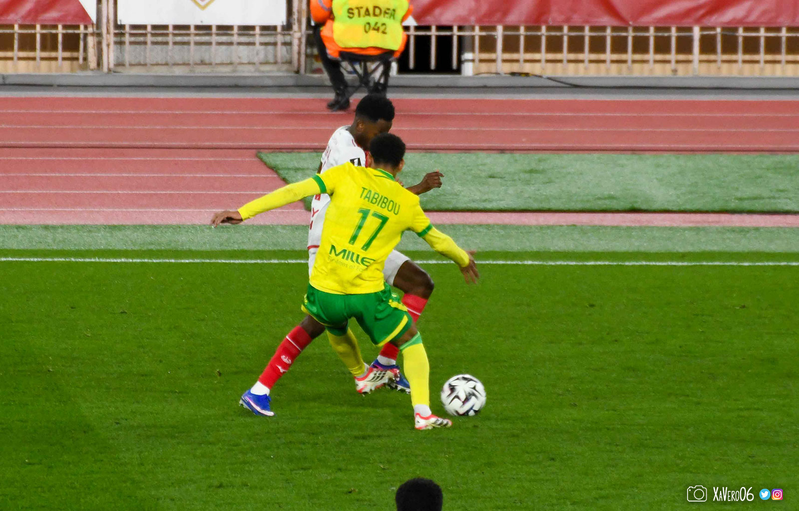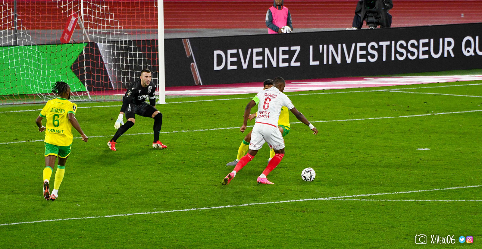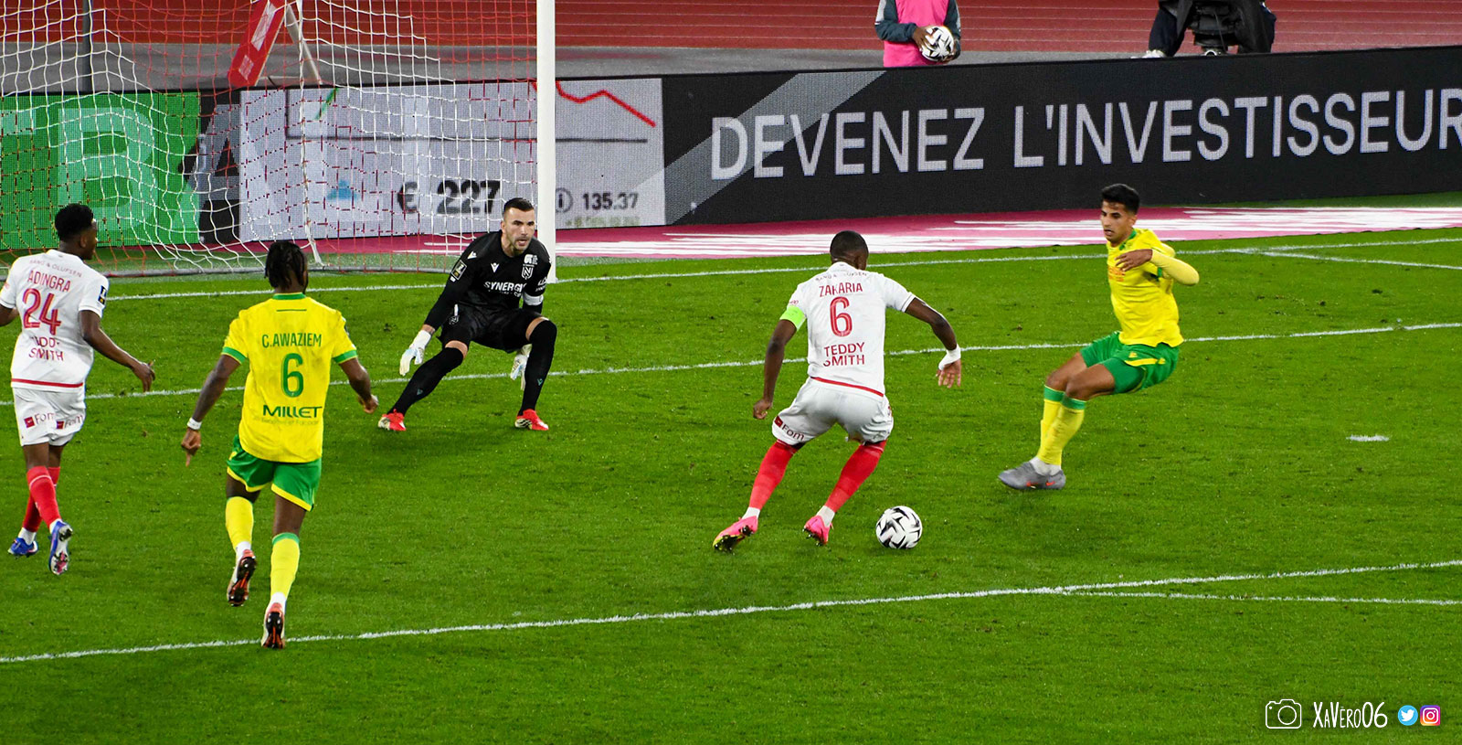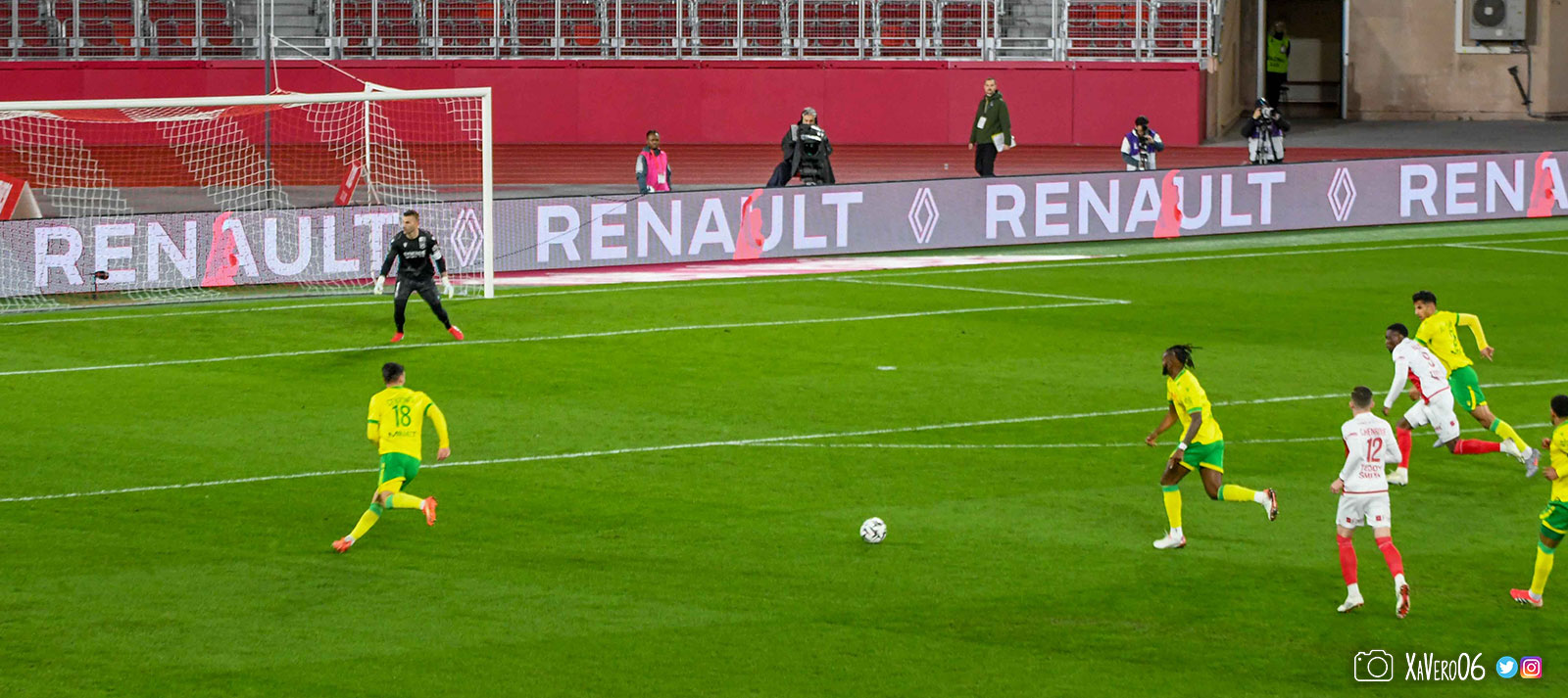 Nantes est encore gêné par le pressing et met en retrait pour sa défense aux 35m. Yousuf cherche Coquelin dans le rond central, pressé par Zakaria, qui pousse le ballon sur Golovin entre le passeur et le receveur, qui se retourne pour lancer un contre à 5 contre 2, avec Akliouche et Balogun à droite, le capitaine de l'ASM et le double buteur à gauche, avec Sylla et Yousuf au milieu.