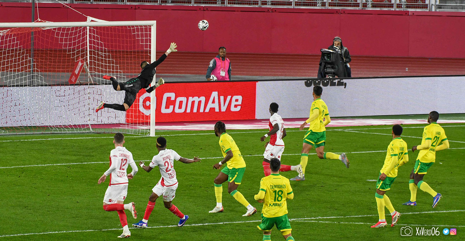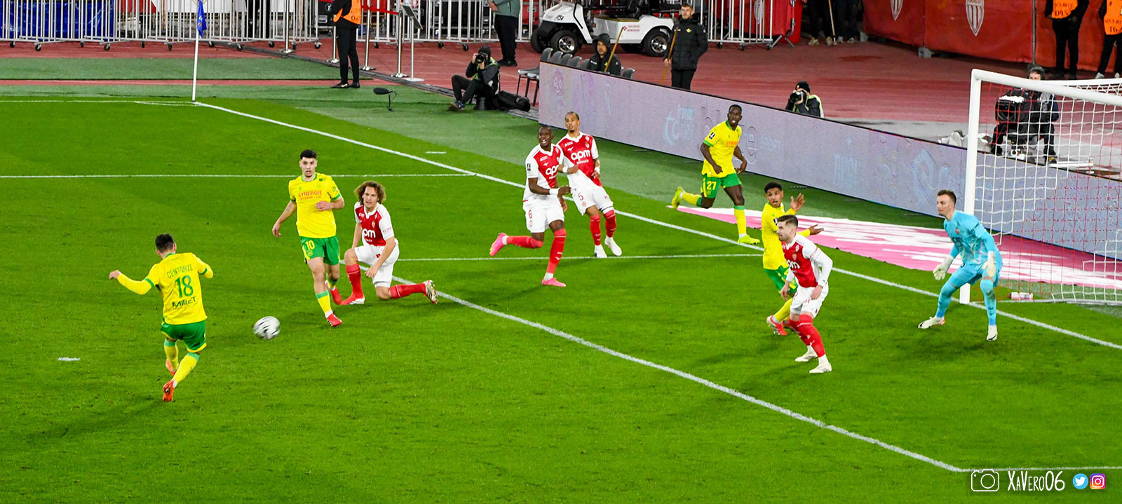 - Côté droit, Akliouche arrive à donner le ballon pour Golovin dans l'axe, qui donne pour Caio sur sa gauche aux 25m qui s'avance tranquillement face au bloc nantais pour donner à Adingra sur la gauche de la surface. Contrôle pour se défaire de Centonze, corchet pour s'éloigner d'Awaziem et frappe, détournée par Yousuf. Corner (40e).