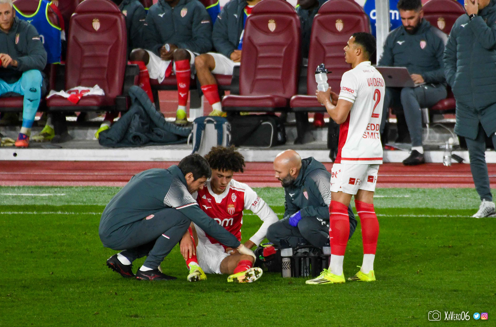 Maghnes Akliouche est resté au sol, les soigneurs sont venus le voir et il demande à sortir (41e).