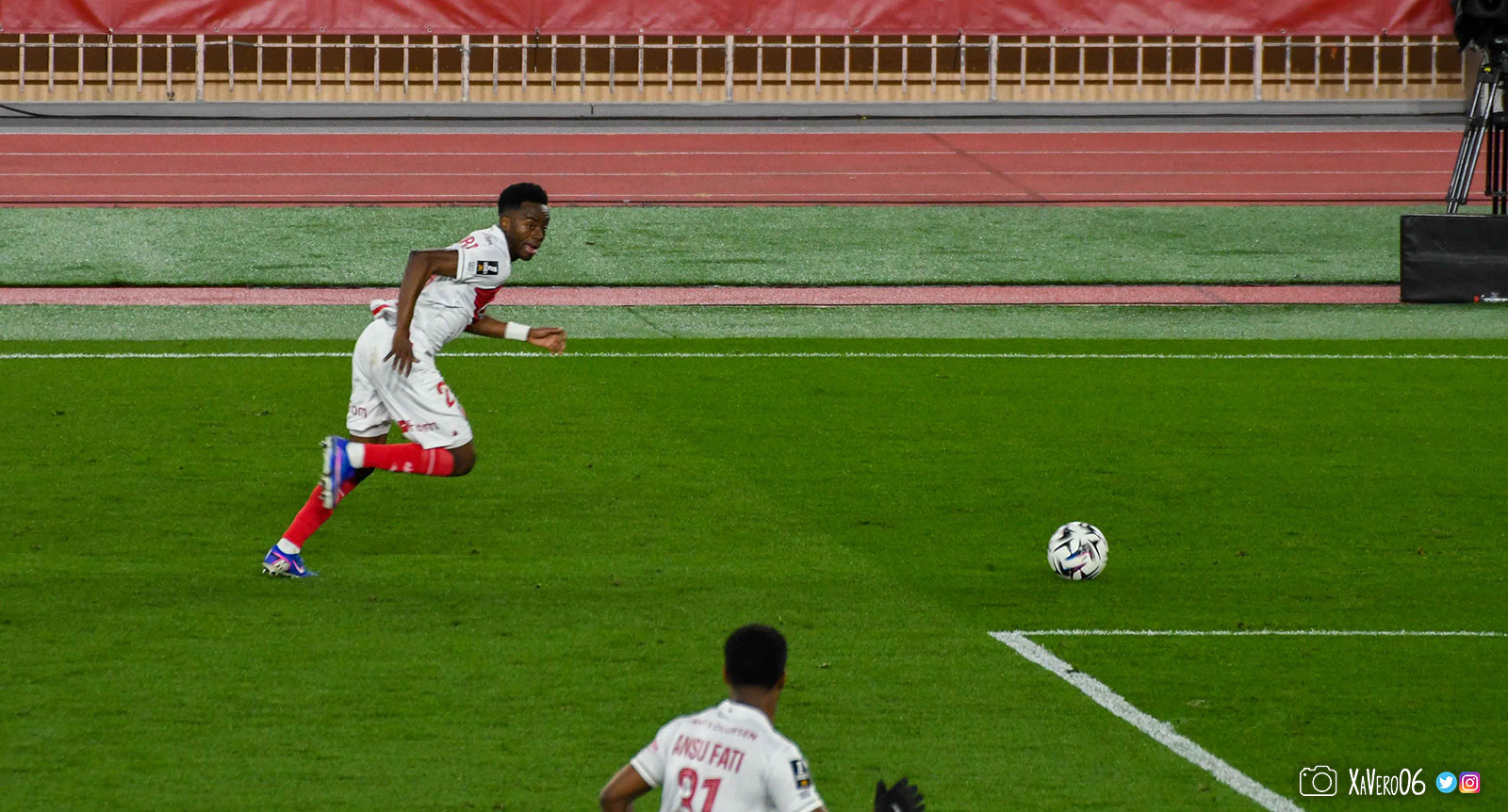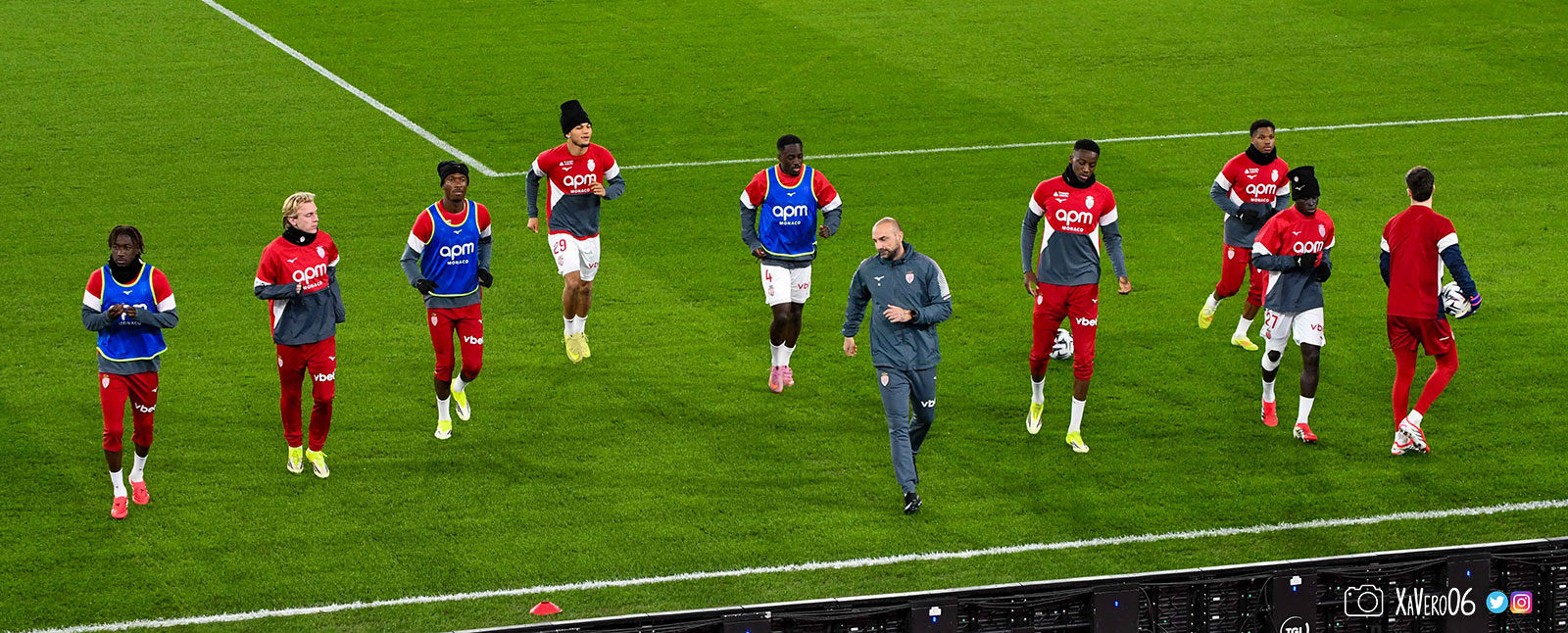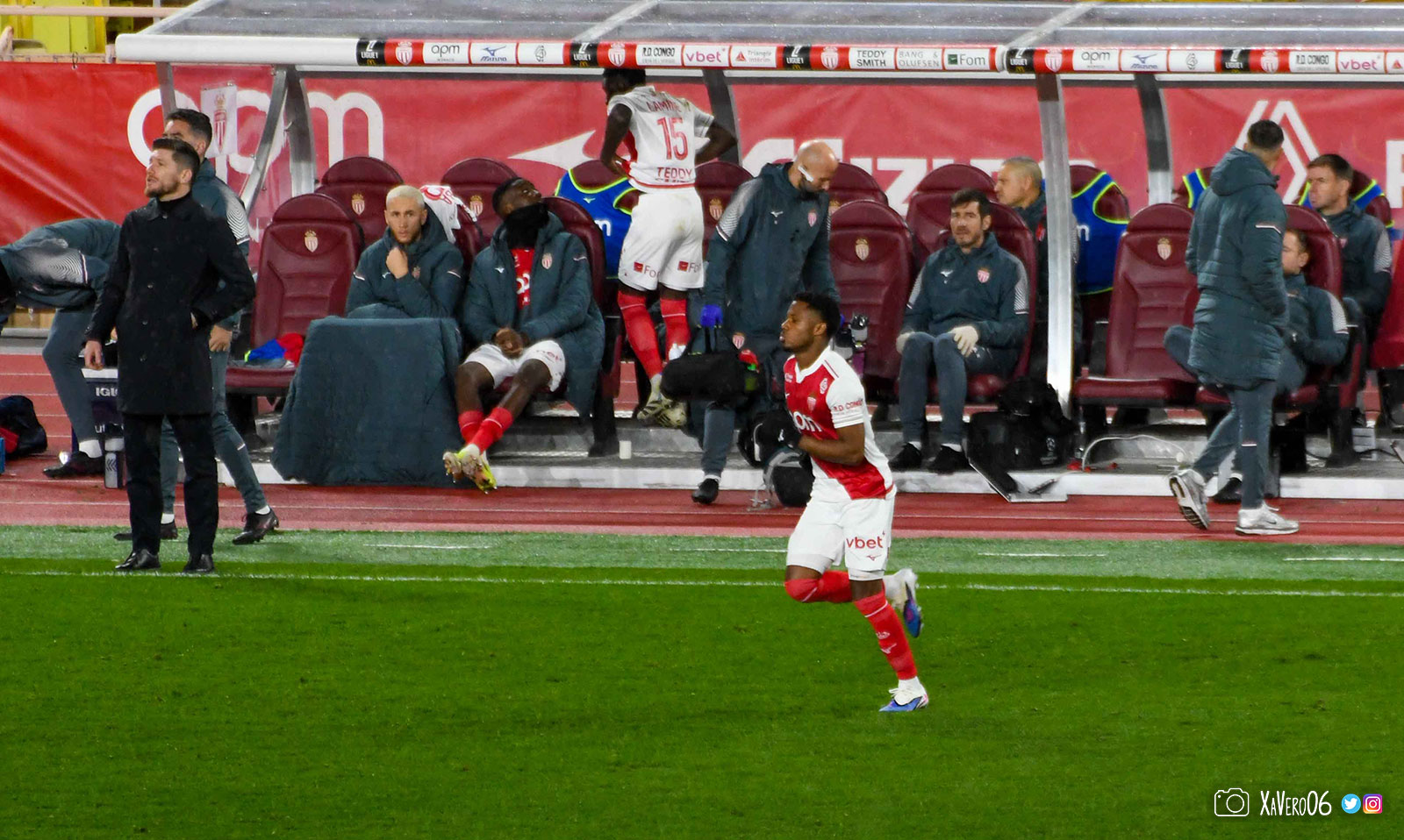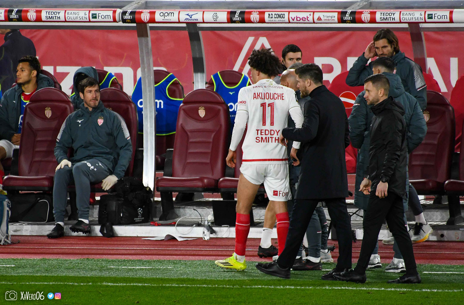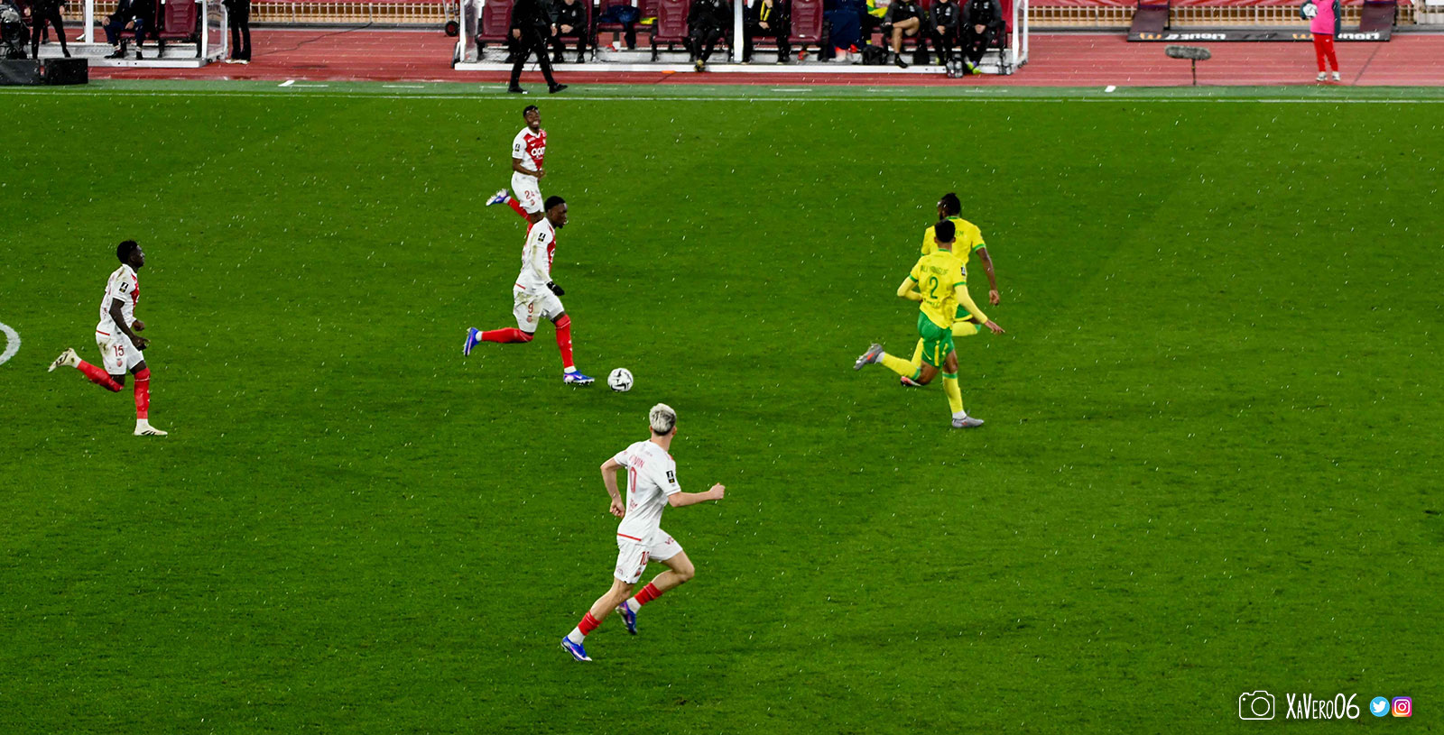 Fort de ses 3 buts d'avance, Monaco baisse de rythme, avec un Akliouche qui se plaint de son genou gauche depuis la 10ème minute, après avoir été pris à contre-pied sur une passe avec un pied d'appui qui avait glissé sur la pelouse humide.