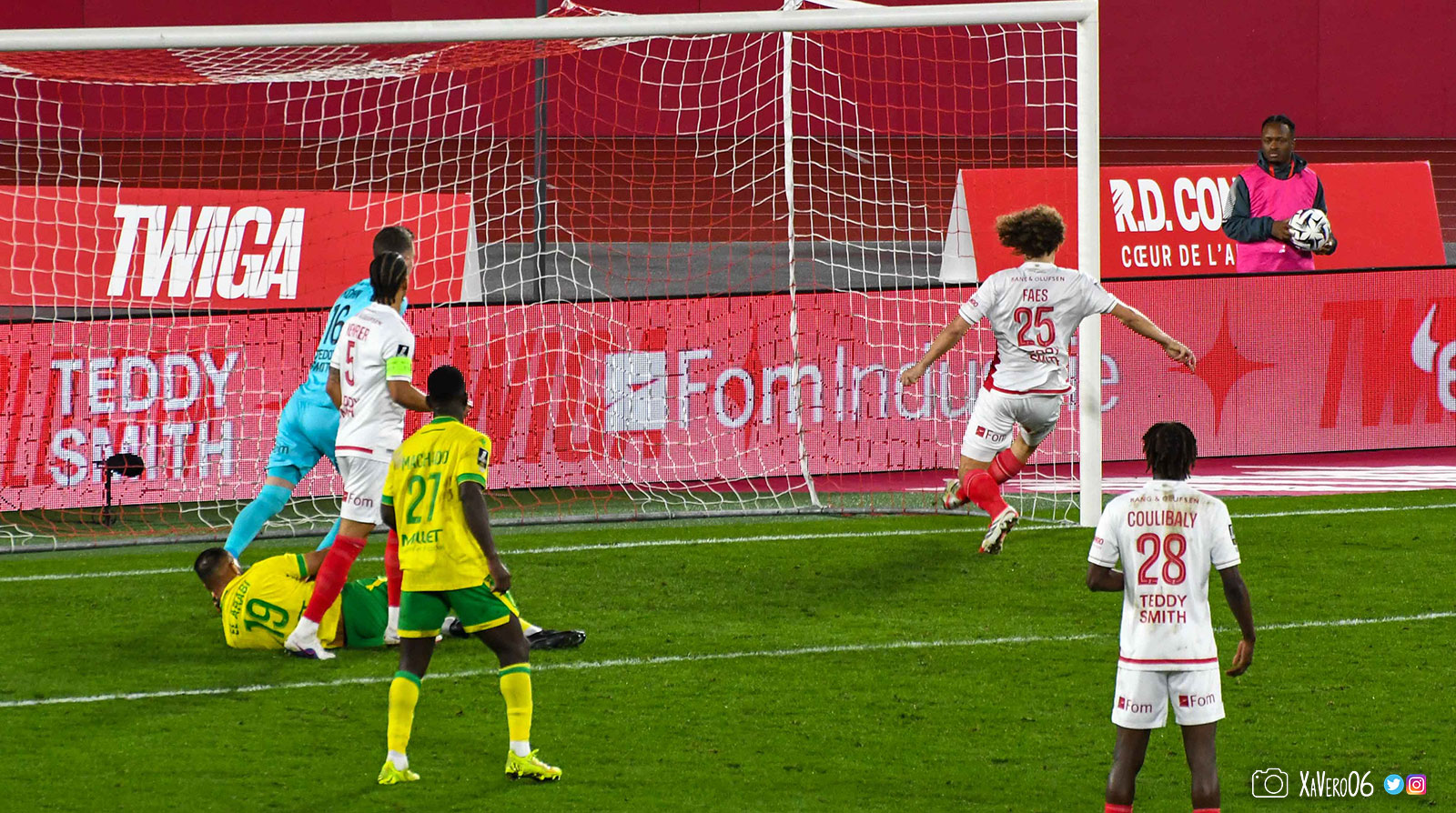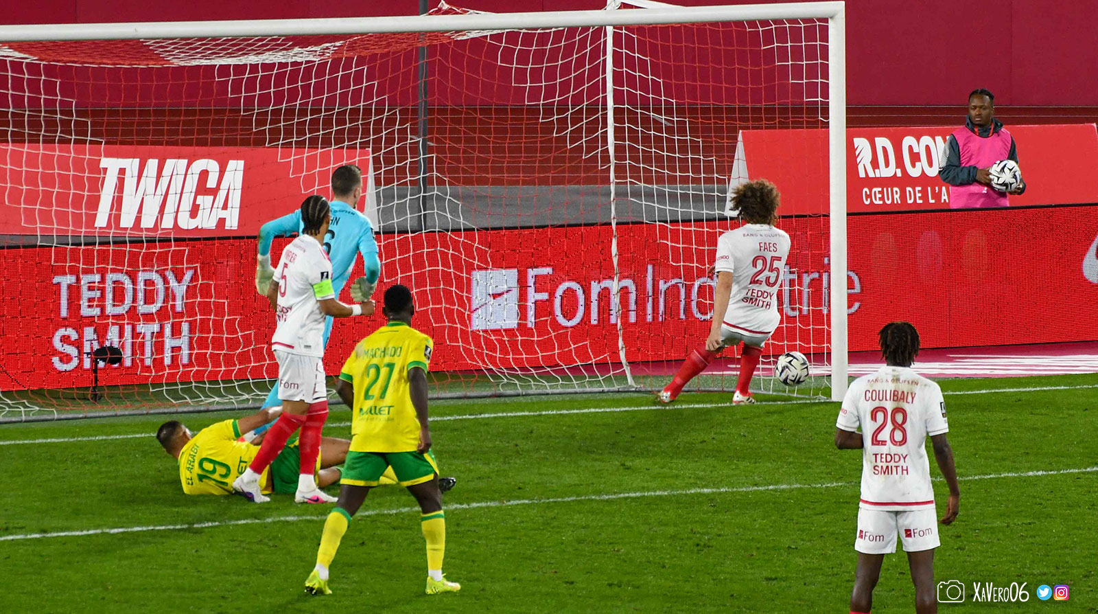 Dernière opportunité pour les nantais, avec Lepenant à gauche qui centre pour Abline derrière le point de pénalty qui remise de la tête aux 6m dans le dos de la défense pour El Arabi qui reprend acrobatiquement en reculant. Le ballon n'est pas fort mais évite la sortie de Köhn et rebondit jusque dans le but, malgré le retour de Faes sur sa ligne (90e+5).
