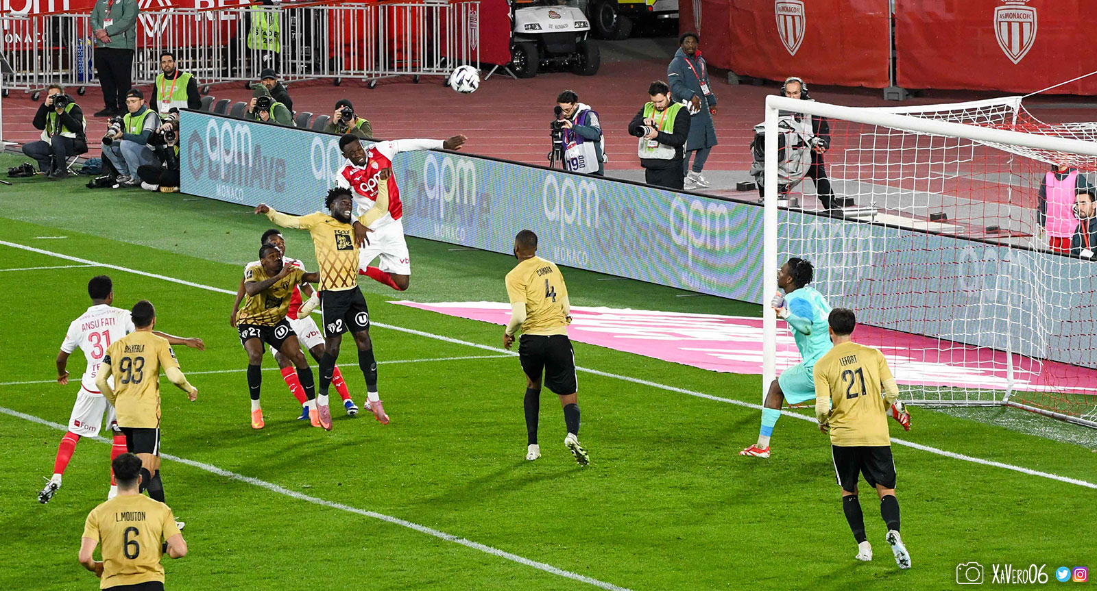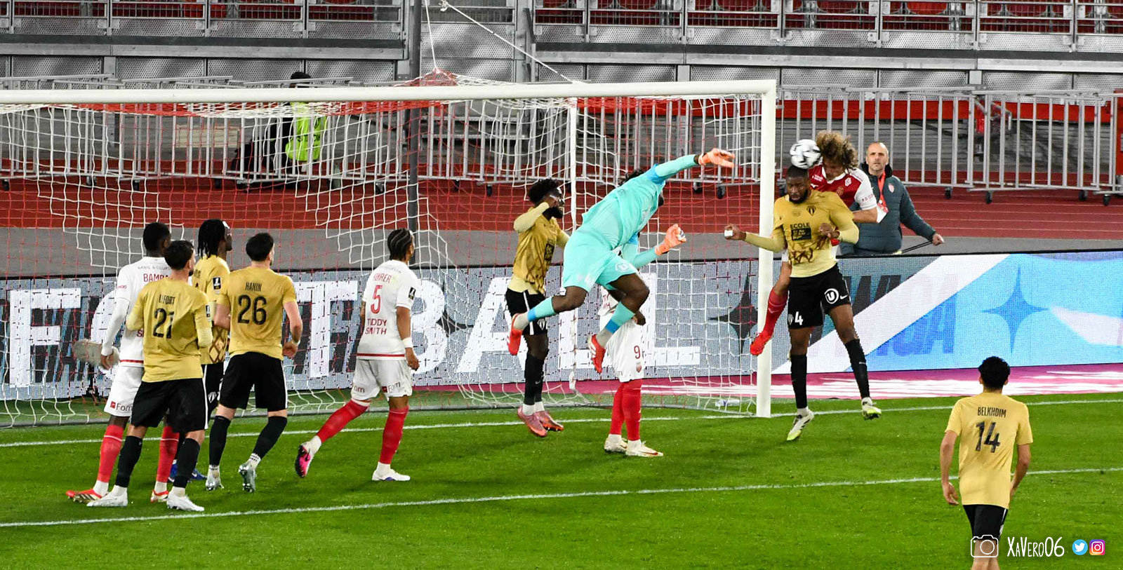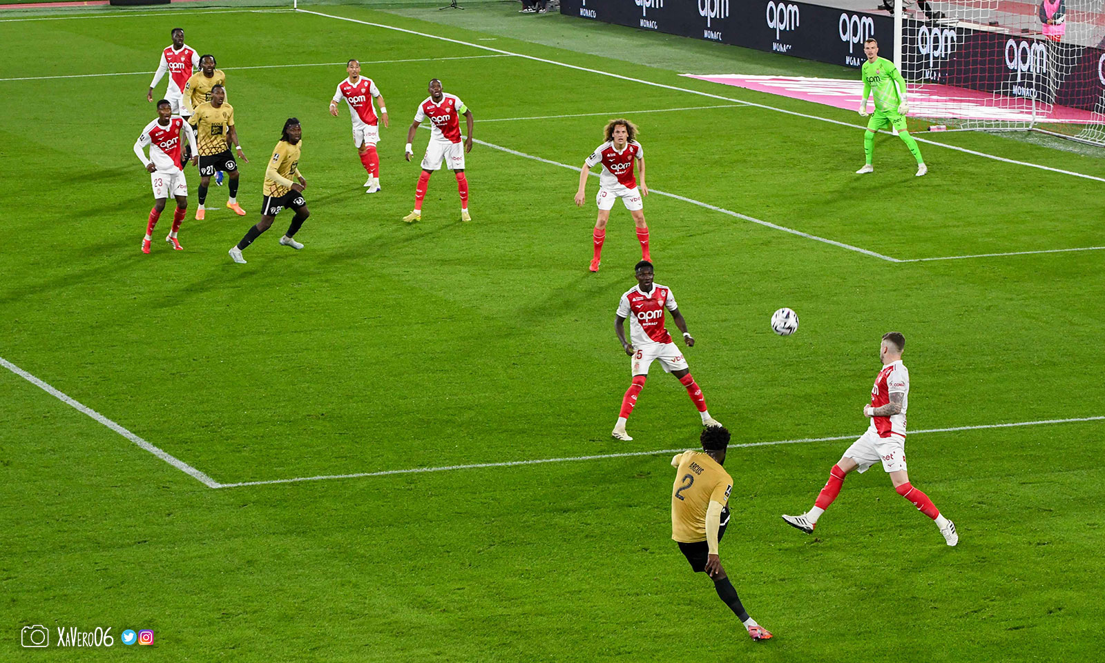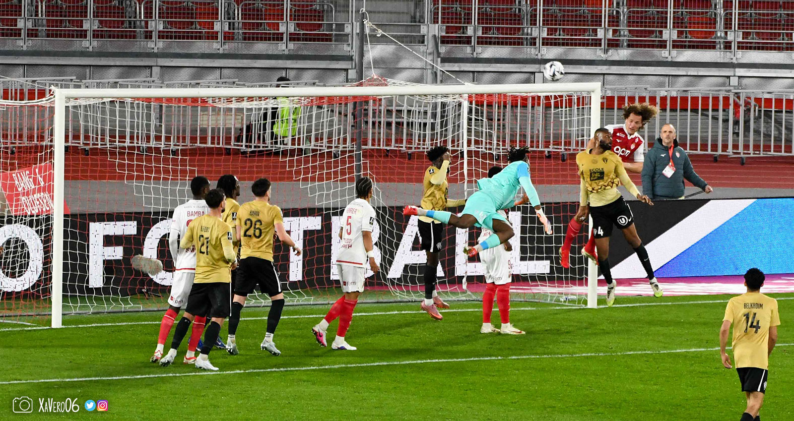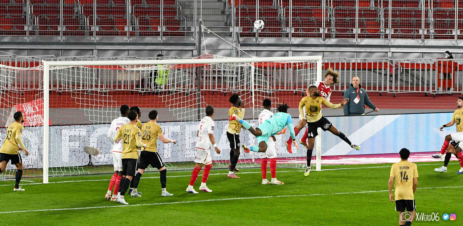 Corner monégasque, raté par Camara. Sur sa deuxième chance, Pona boxe le ballon et Raolisoa récupère et accélère côté gauche, bloqué par Golovin le long de la touche, mais il revient sur son pied droit et centre dans l'axe pour Belkhdim, oublié au marquage par Adingra qui lui court 3m derrière.