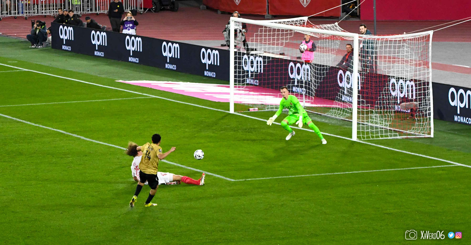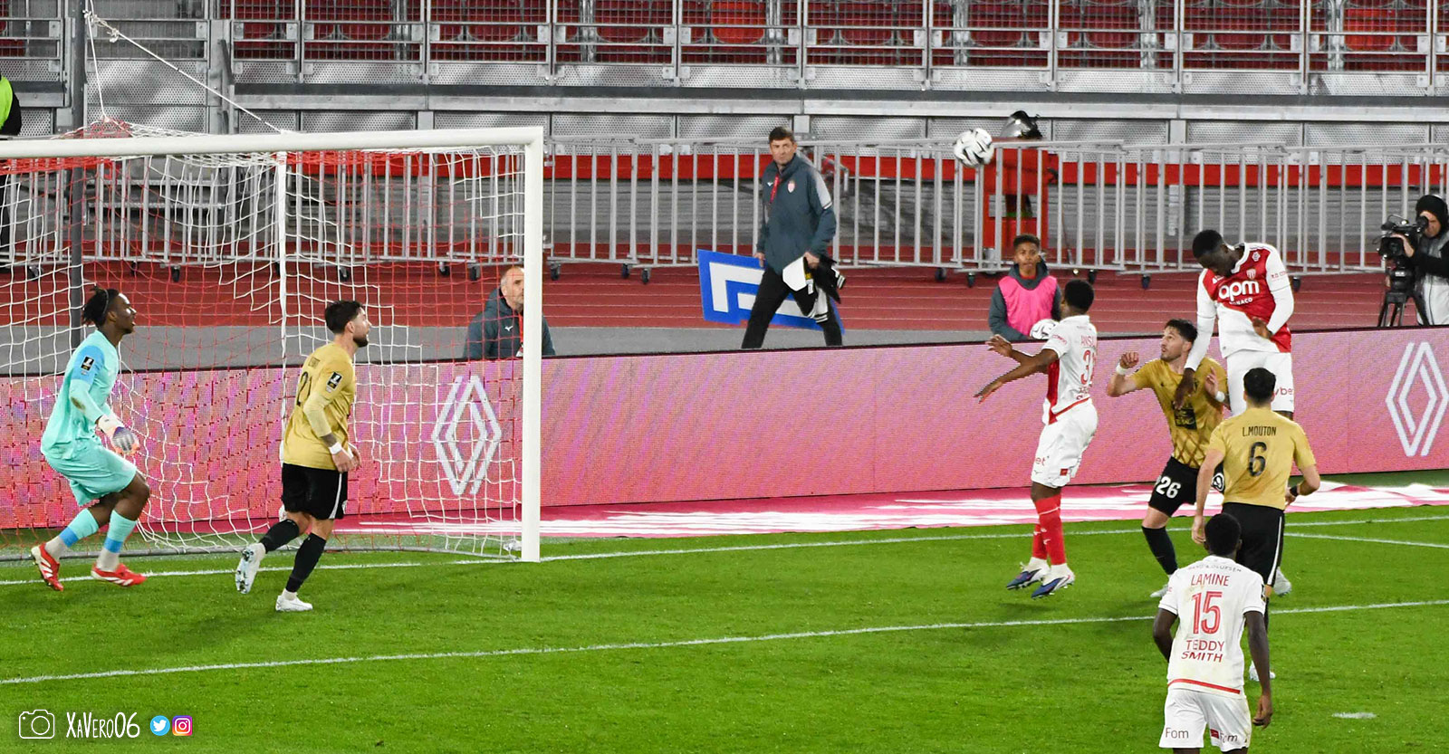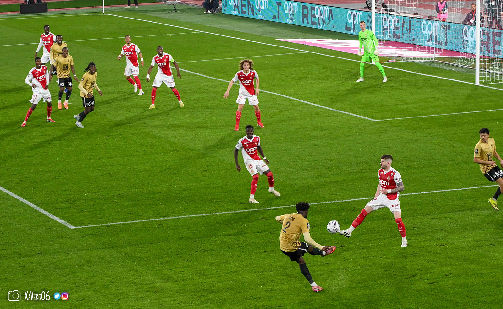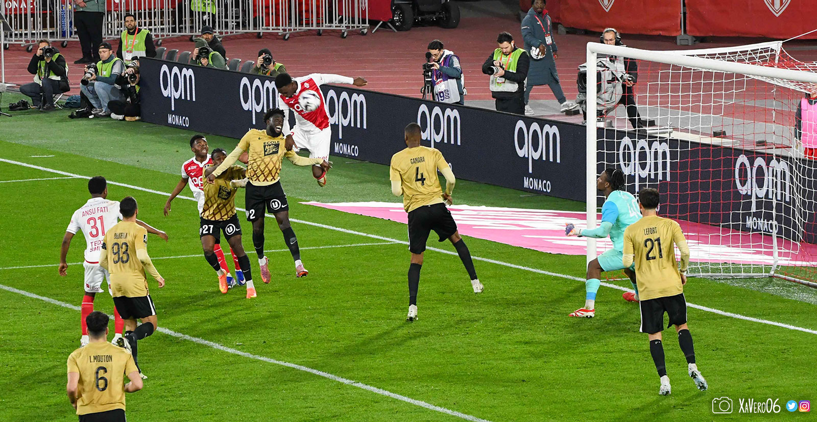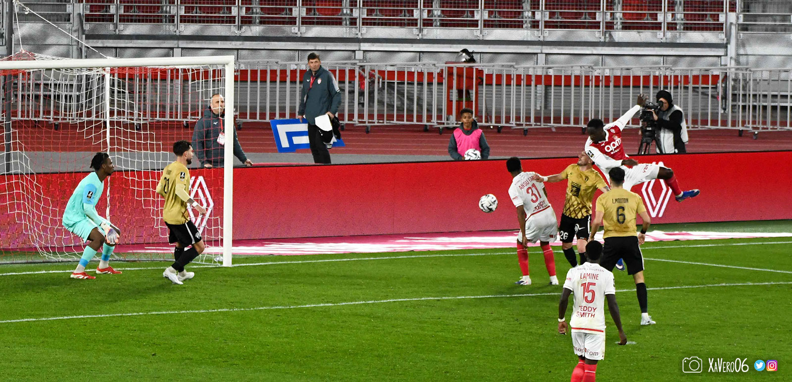 Corner monégasque, raté par Camara. Sur sa deuxième chance, Pona boxe le ballon et Raolisoa récupère et accélère côté gauche, bloqué par Golovin le long de la touche, mais il revient sur son pied droit et centre dans l'axe pour Belkhdim, oublié au marquage par Adingra qui lui court 3m derrière.