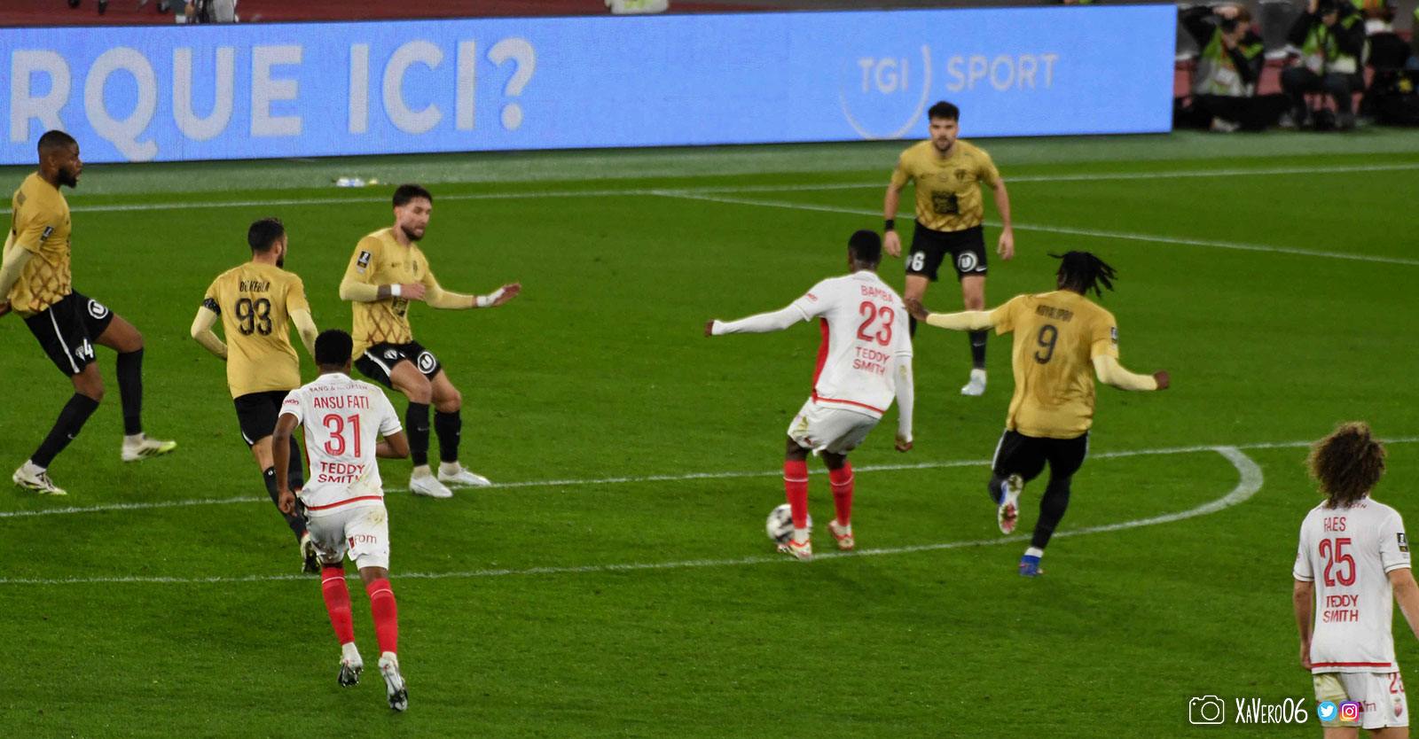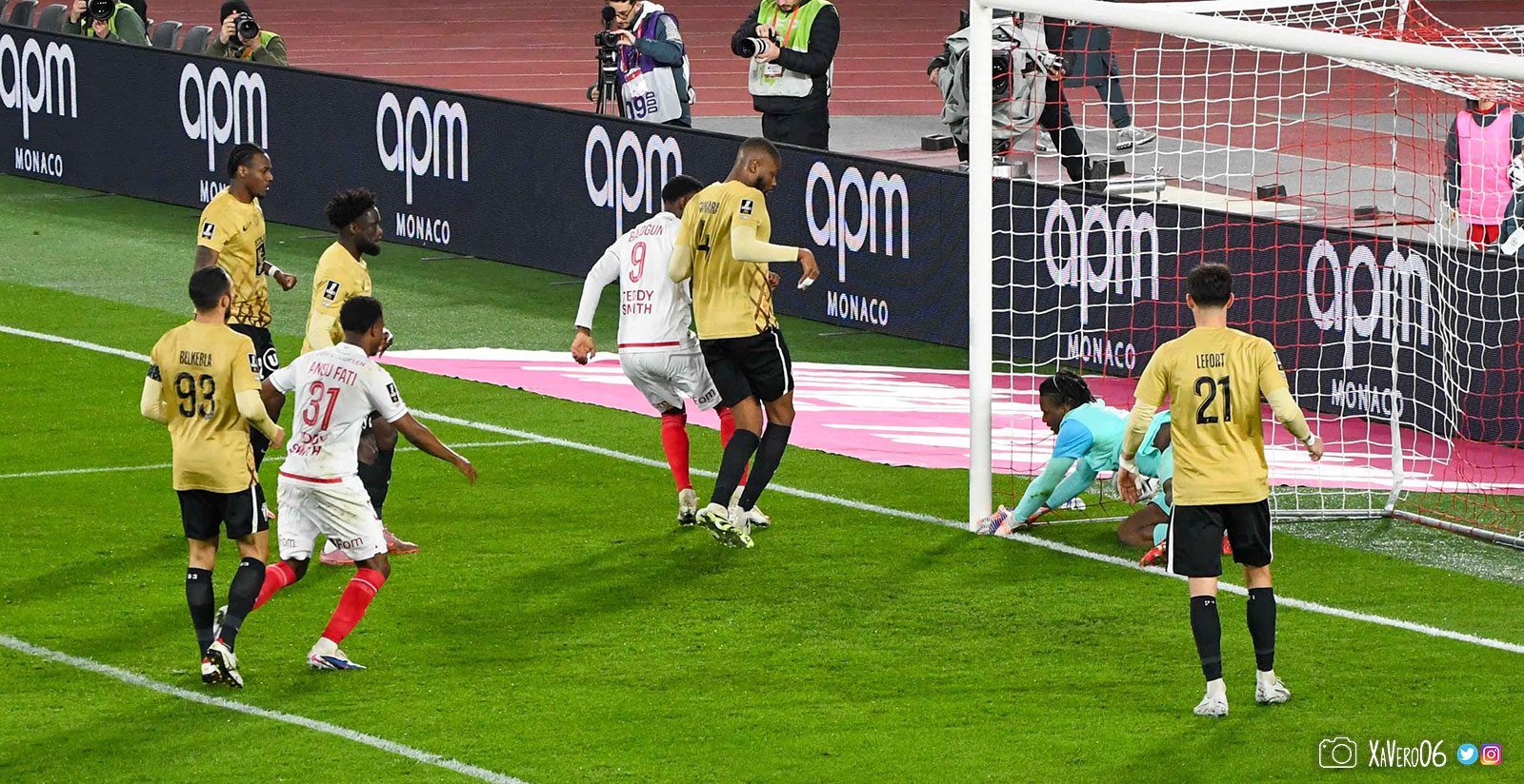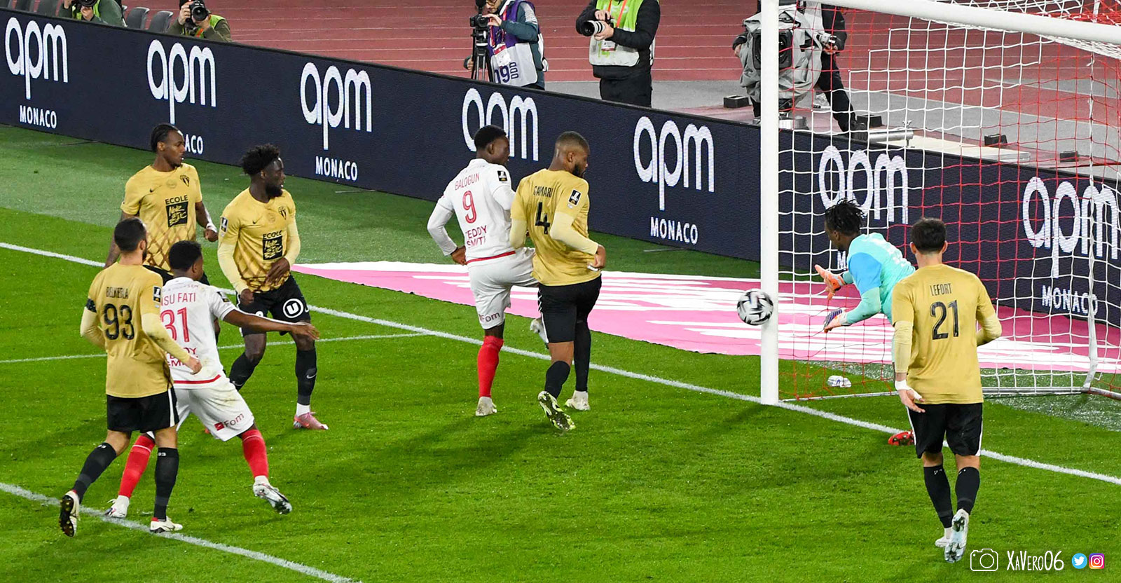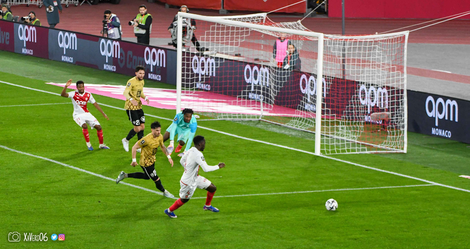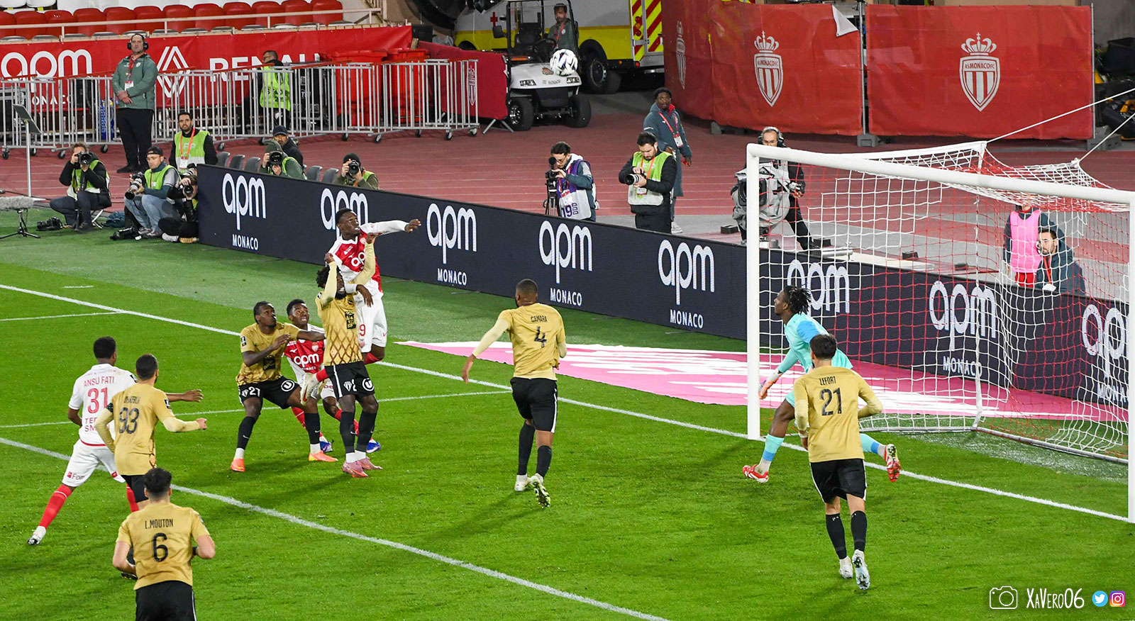 Corner monégasque, raté par Camara. Sur sa deuxième chance, Pona boxe le ballon et Raolisoa récupère et accélère côté gauche, bloqué par Golovin le long de la touche, mais il revient sur son pied droit et centre dans l'axe pour Belkhdim, oublié au marquage par Adingra qui lui court 3m derrière.