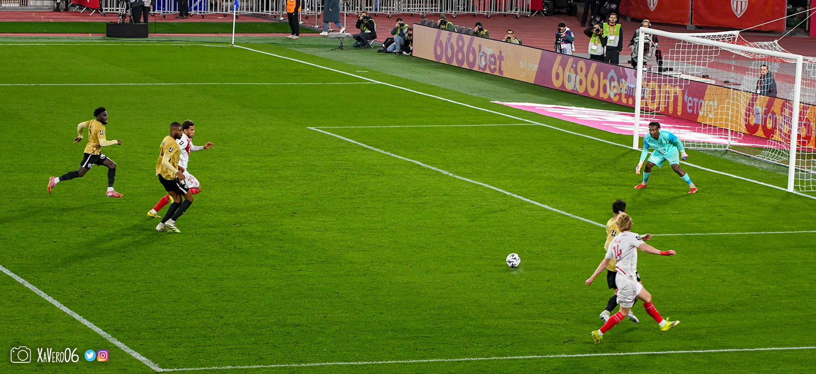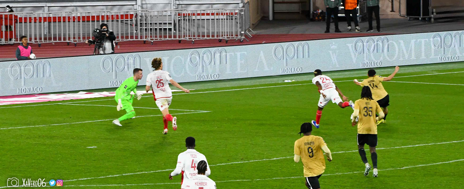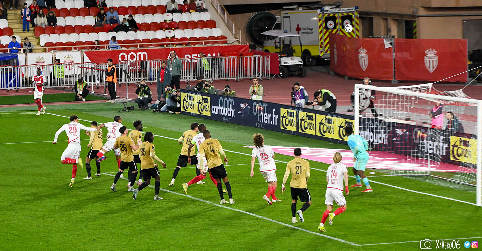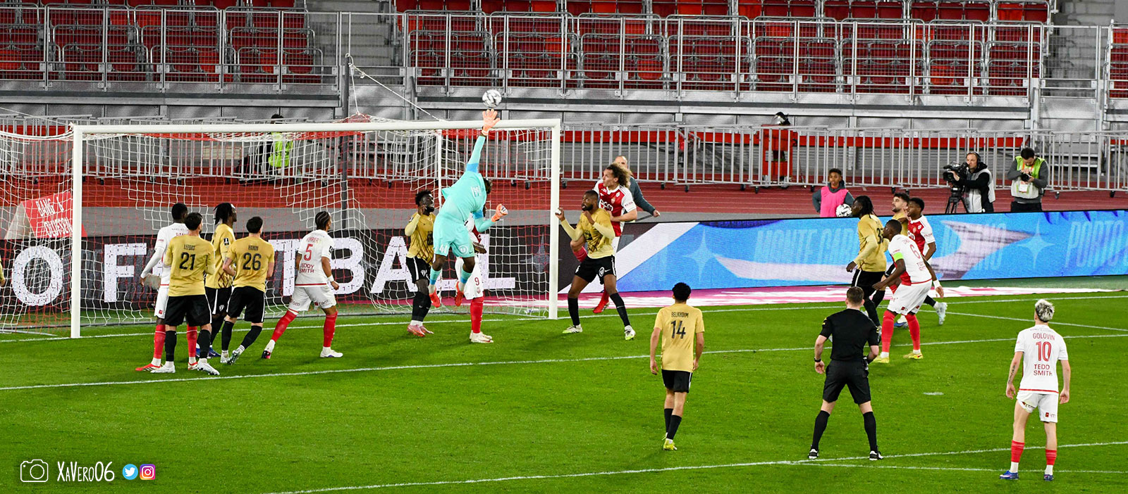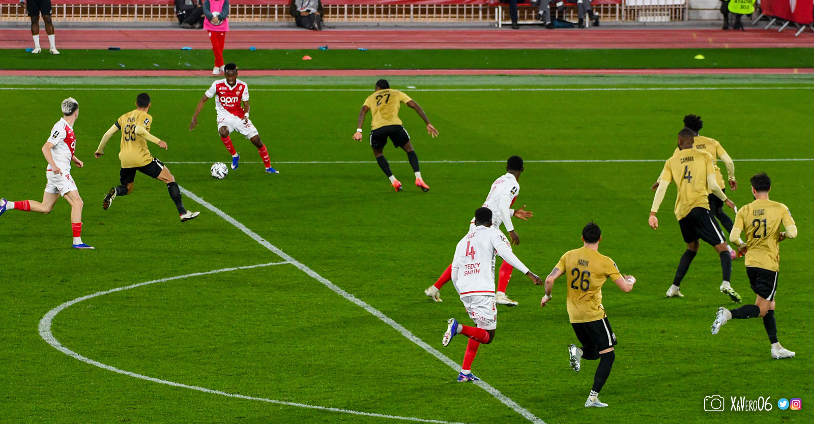 Corner monégasque, raté par Camara. Sur sa deuxième chance, Pona boxe le ballon et Raolisoa récupère et accélère côté gauche, bloqué par Golovin le long de la touche, mais il revient sur son pied droit et centre dans l'axe pour Belkhdim, oublié au marquage par Adingra qui lui court 3m derrière.