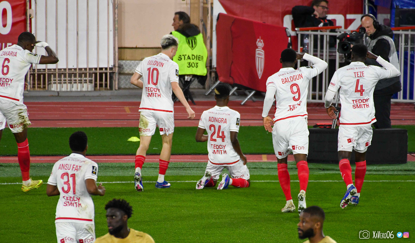 Troisième but à domicile de Simon Adingra, après son doublé contre Nantes, qui est fêté par ses partenaires qui lui font le salut militaire, signature de l'ivoirien après ses buts.